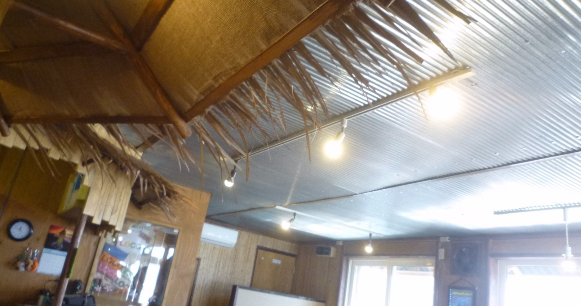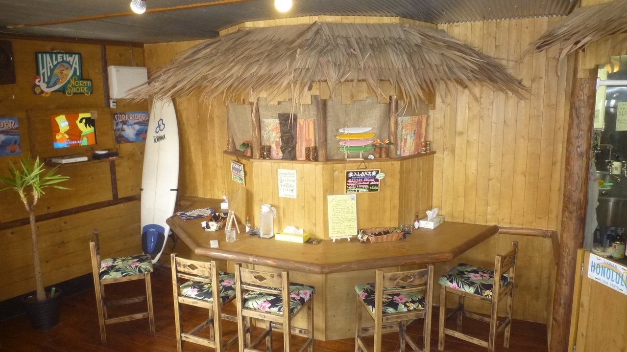 店内に入ると、なんと南国ティストたっぷりでして、この凝ったカウンター周り、そして天井を見てくださいー。この店内を店主が作ったんです。すばらしいー