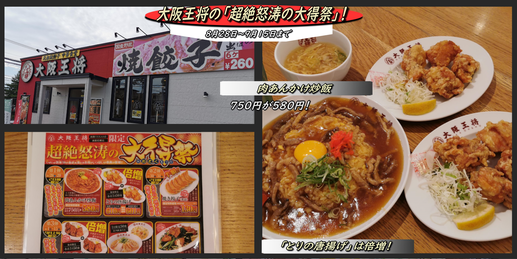 大阪王将の「超絶怒涛の大得祭」はお得です。(^^) 9月15日まで! 大阪王将では「超絶怒涛の大得祭」を9月15日まで開催。お得に食事をすることができます。ランチはあんかけ炒飯と鶏唐揚げ。函館の2店舗が利用できます。 大阪王将では「超絶怒涛の大得祭」を9月15日まで開催。お得に食事をすることができます。ランチはあんかけ炒飯と鶏唐揚げ。函館の2店舗が利用できます。 続きを読む