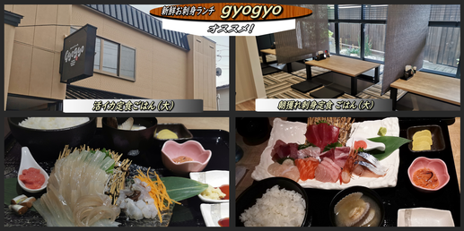 刺身定食専門の「gyogyo ぎょぎょ」に再び! 活イカ定食と刺身定食 オープンしたgyogyo(ぎょぎょ)に再訪。今回は活イカ刺身定食で透明なイカはさすが活!刺身定食は変わらずのコスパで10種類くらいが。オススメです。 オープンしたgyogyo(ぎょぎょ)に再訪。今回は活イカ刺身定食で透明なイカはさすが活!刺身定食は変わらずのコスパで10種類くらいが。オススメです。 続きを読む