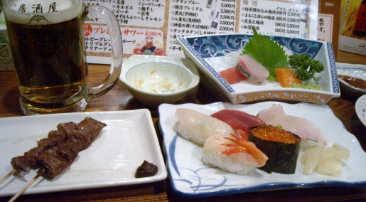 晩酌セットは、ドリンク一杯+つきだし+寿し5カン+焼き鳥2本