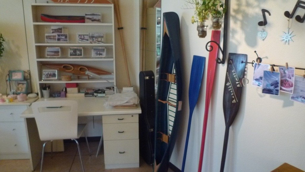 川が流れる側には素敵なテラスもあり、その向こうには手作りのカヌーがあります。