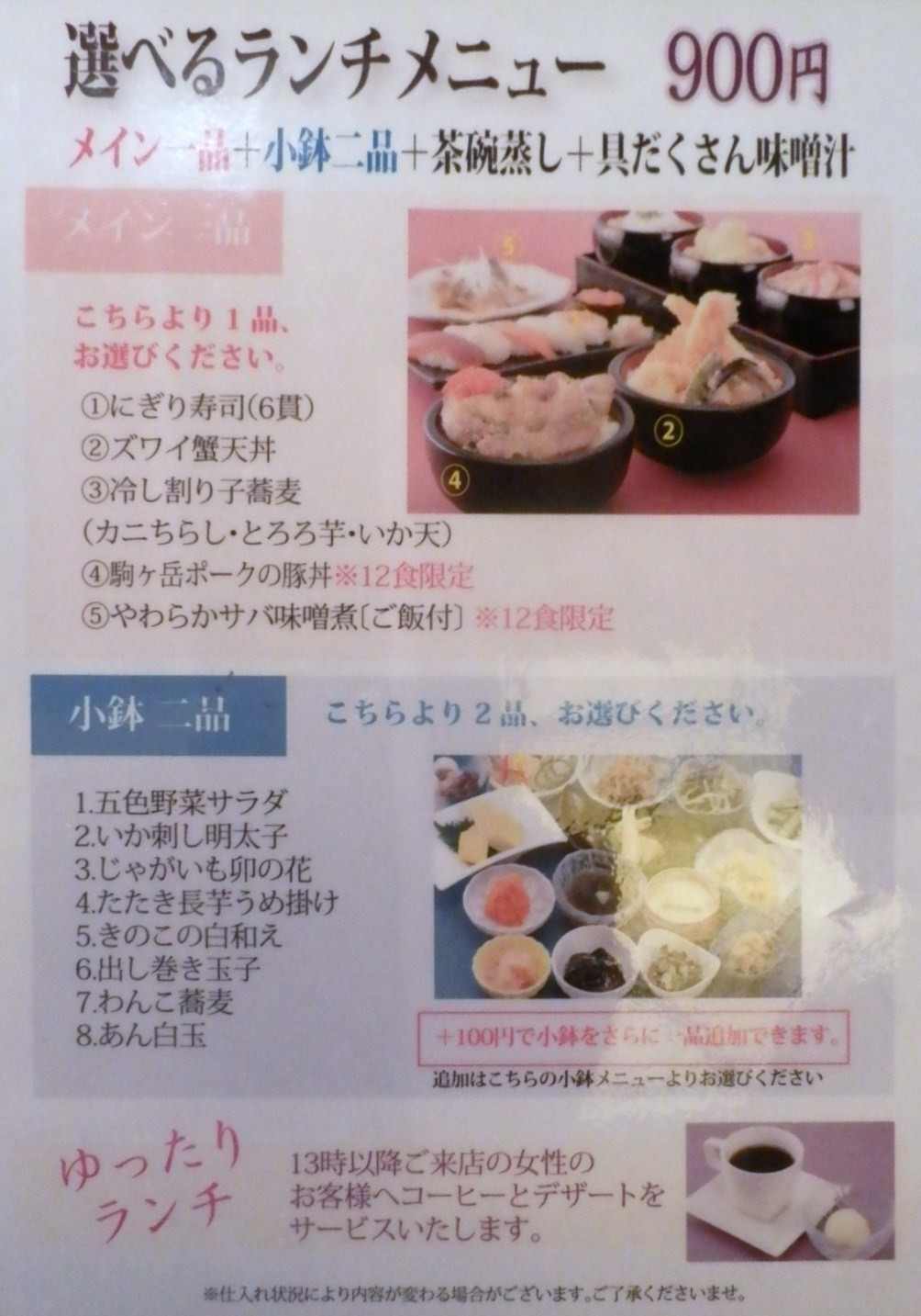 注文したのは、「9月の選べるランチ」 900円でして、好きなおかずをメインから1品、小針から2品選べるというものです。