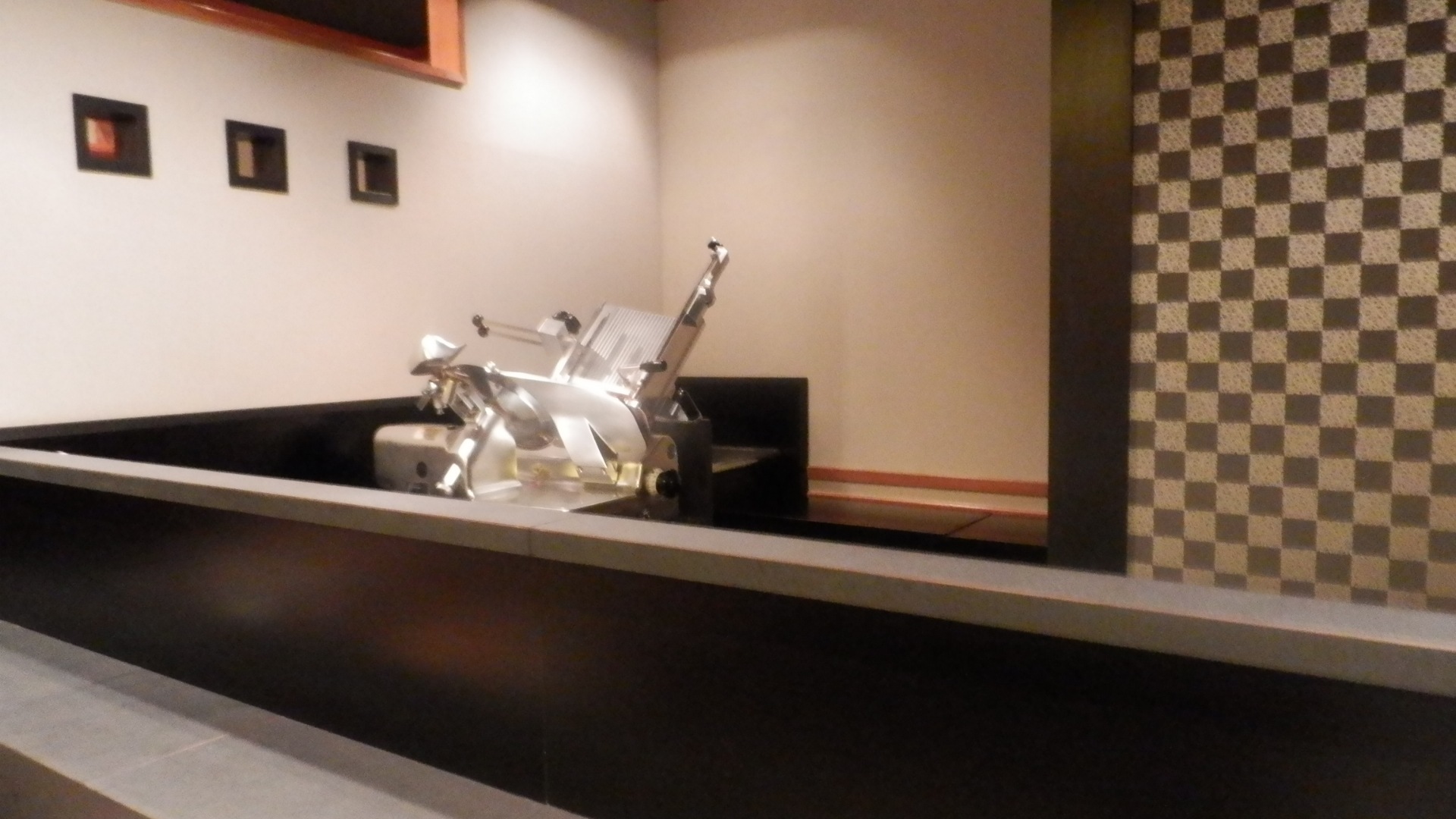 この肉、しゃぶしゃぶ屋さんの強みでカウンターの前においてある調理器で加工できるのです。