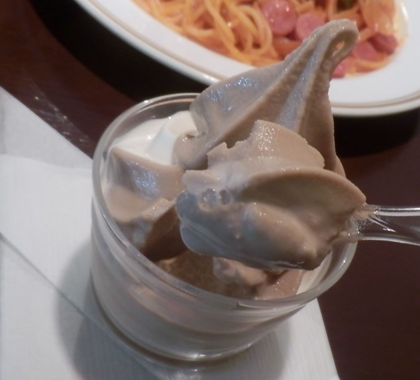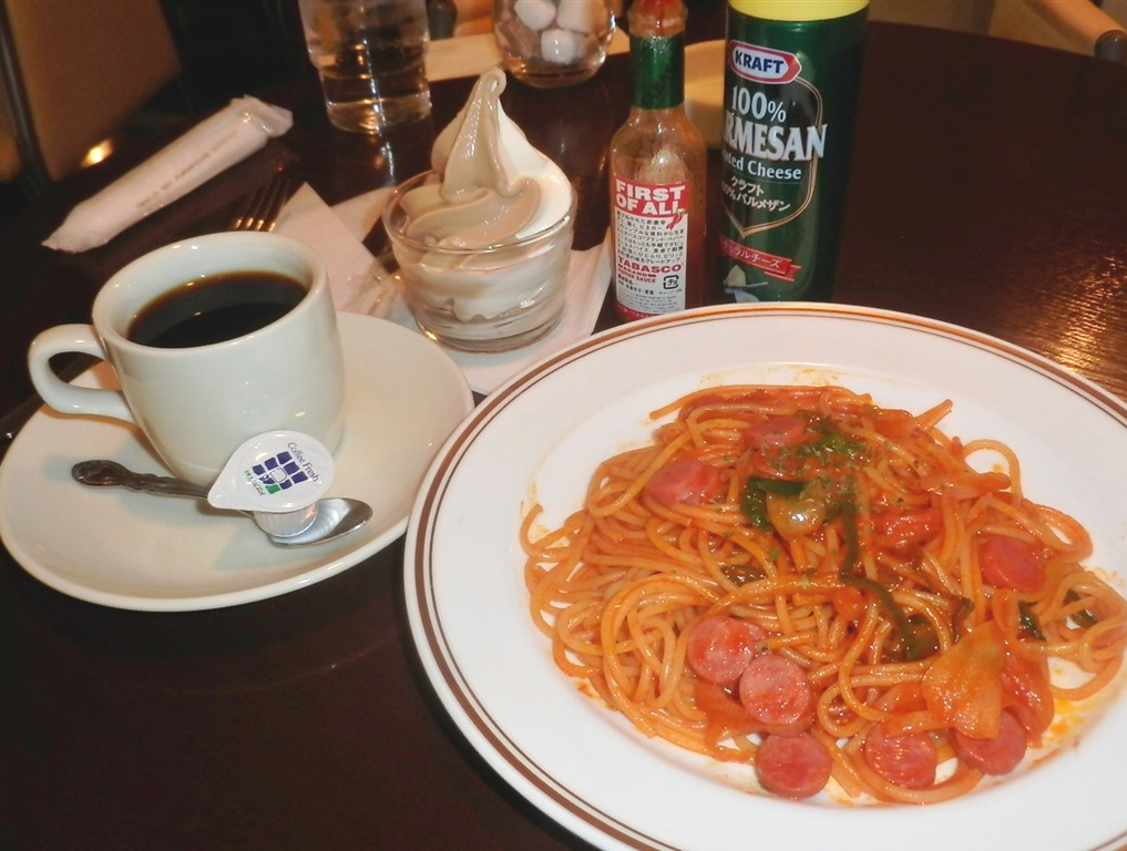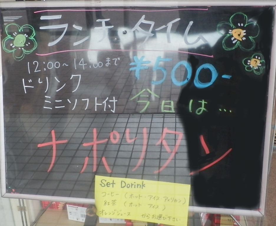 これ見てください〜。なんと、ナポリタンに本格コーヒー、ソフトクリームがついて、な、なんと500円なんですヨ。
