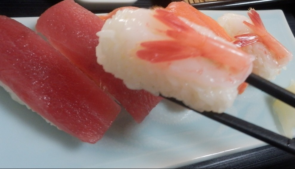 寿司は、6カンありまして、マグロ、エビ、ルイベの種類となっています。