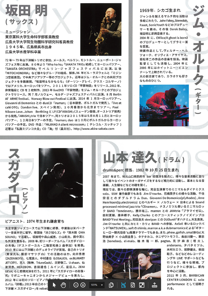 坂田明(サックス)、ジム・オルーク(ギター)、スガダイロー(ピアノ)、山本達久(ドラム)