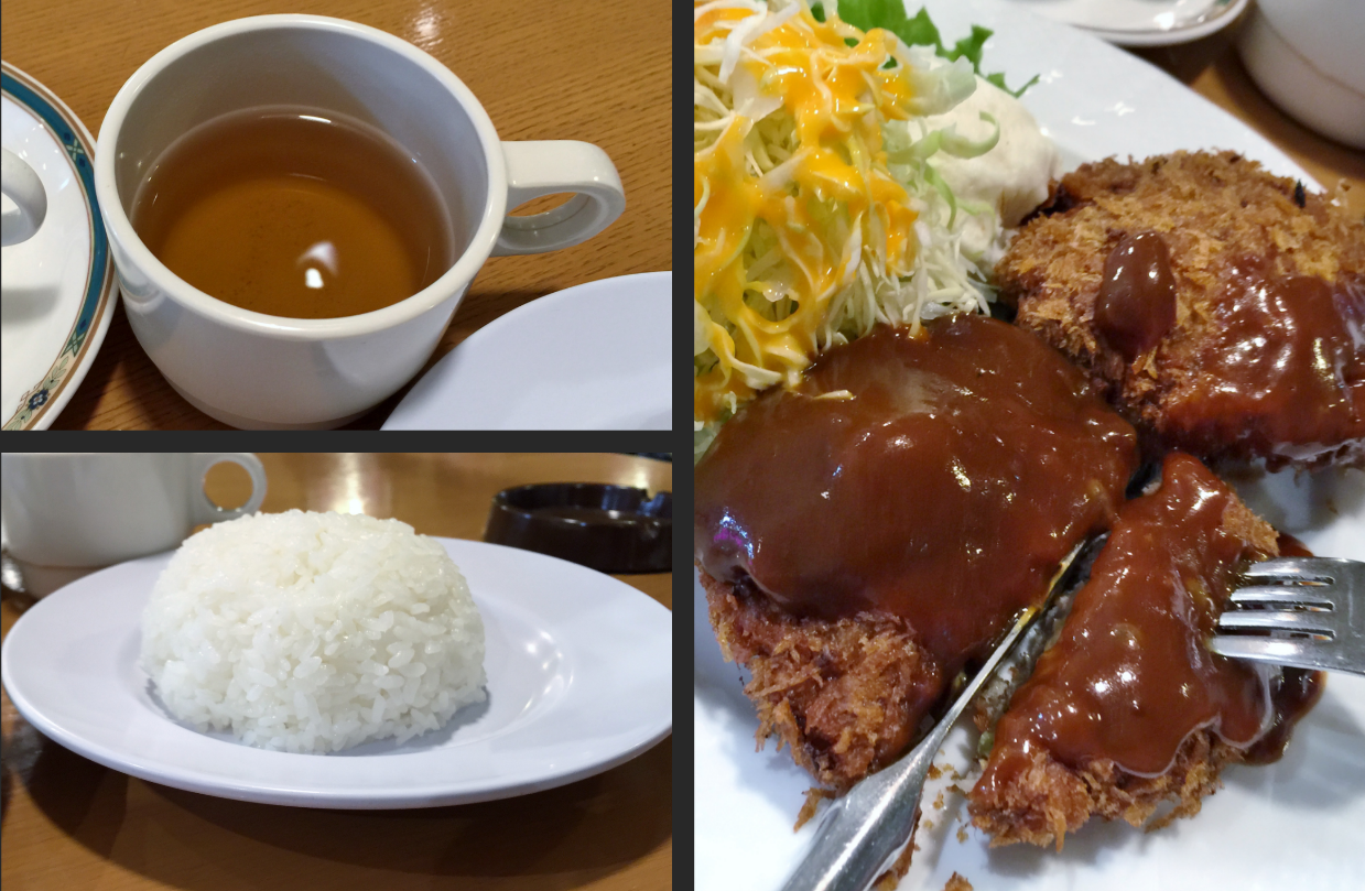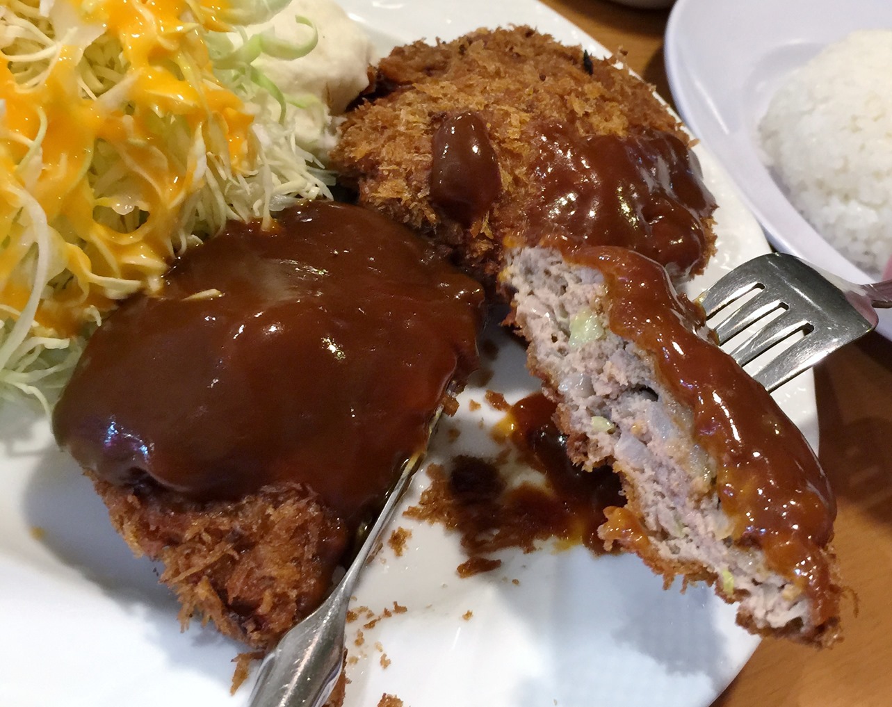 デミグラスソースがかかっていまして味わってみると、けっこう甘めの味付けです。