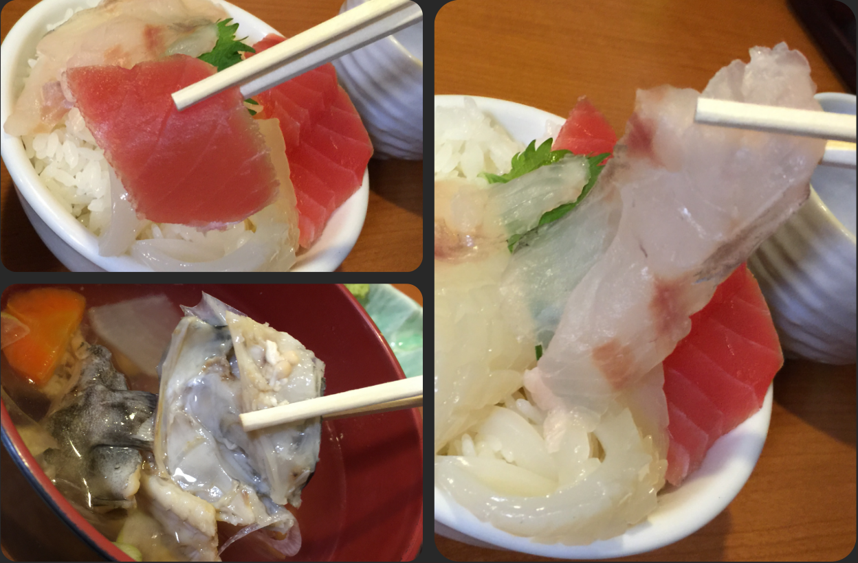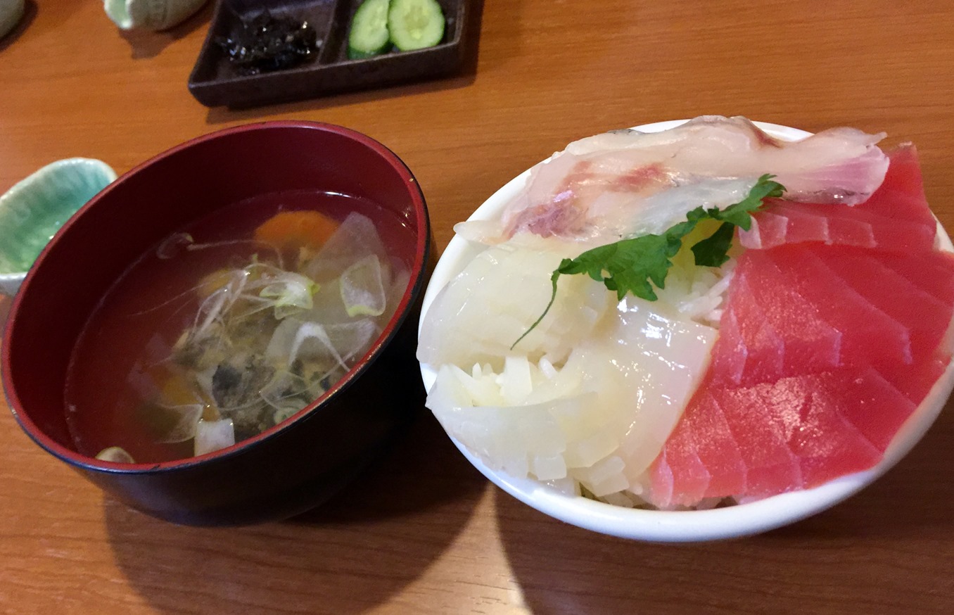 オヤジは、ソイとマグロにしました。器は、汁の椀と似たような大きさでして、刺身の盛りは、こんな感じでした。