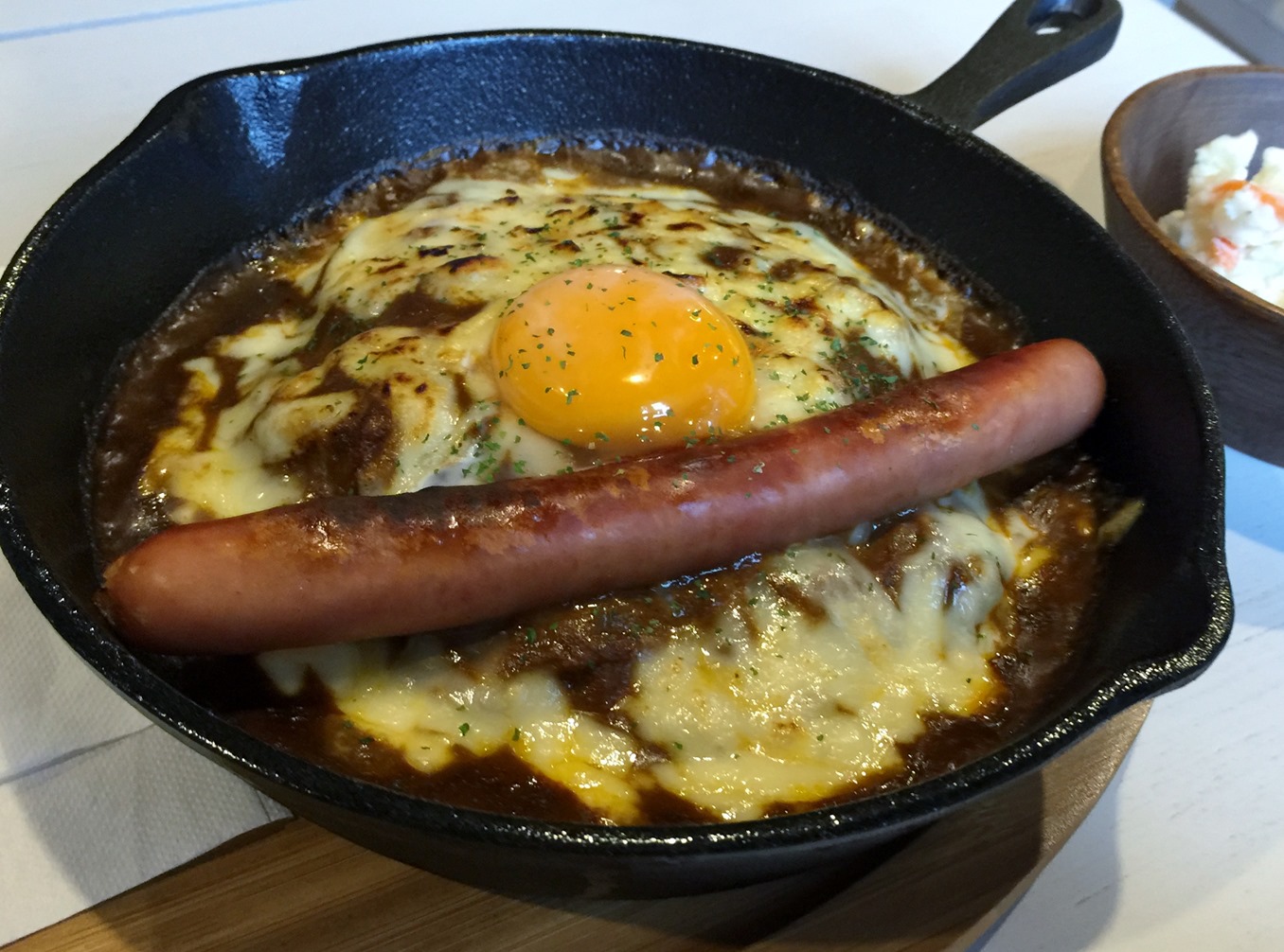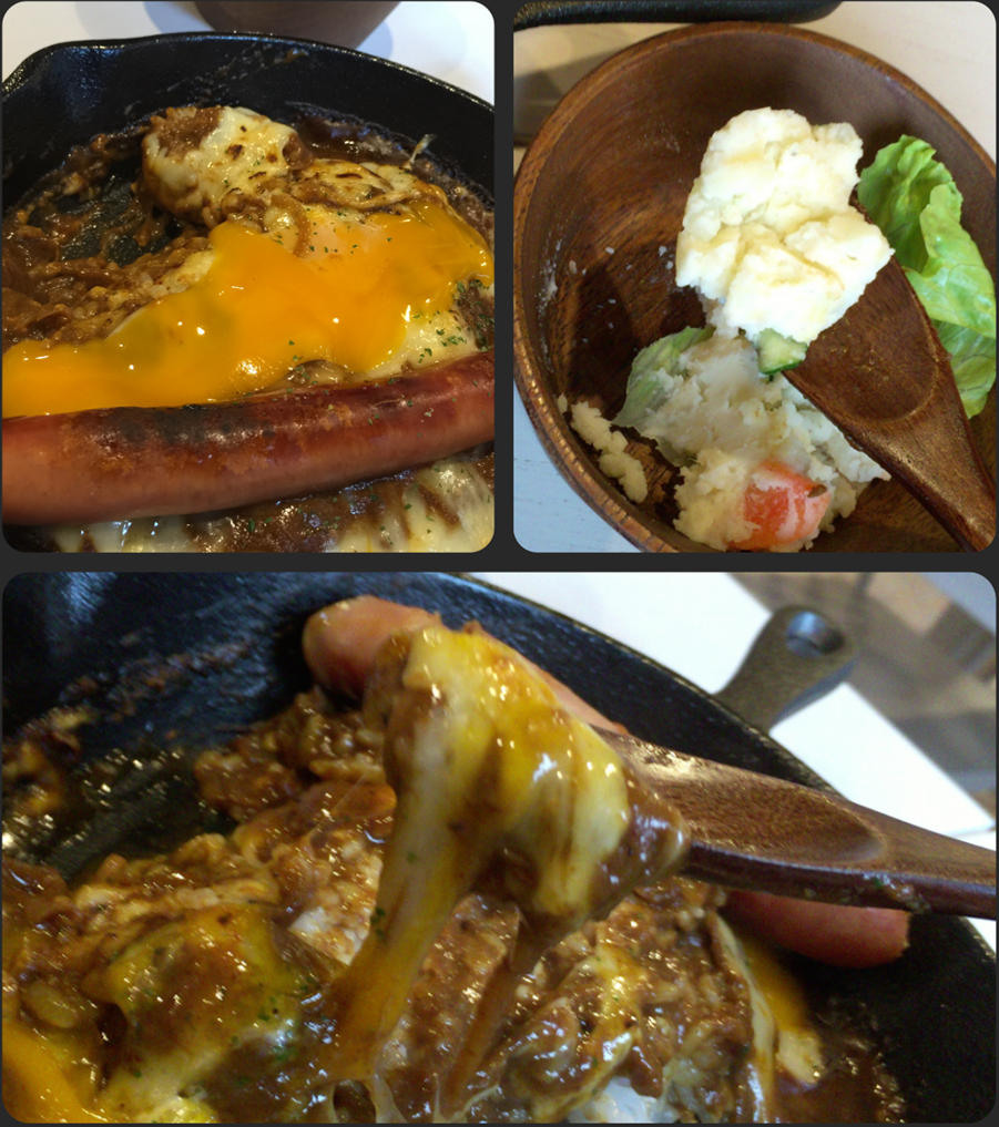 オヤジは焼きカレー(680円)で、トッピングは、ロングソーセージ(200円)と玉子(80円)です。