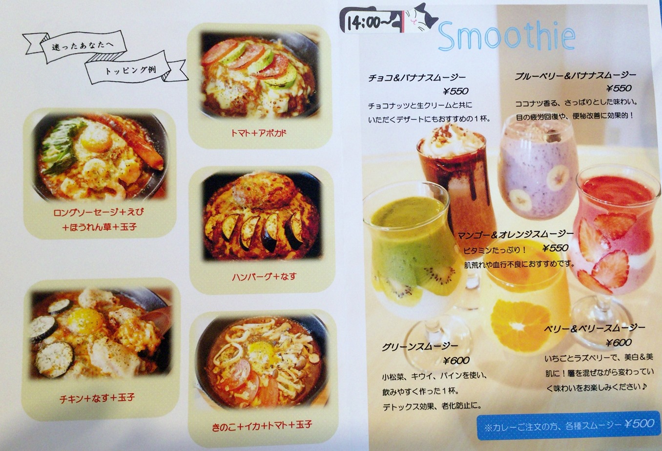 迷った場合のトッピング例と、スムージーのメニューです。