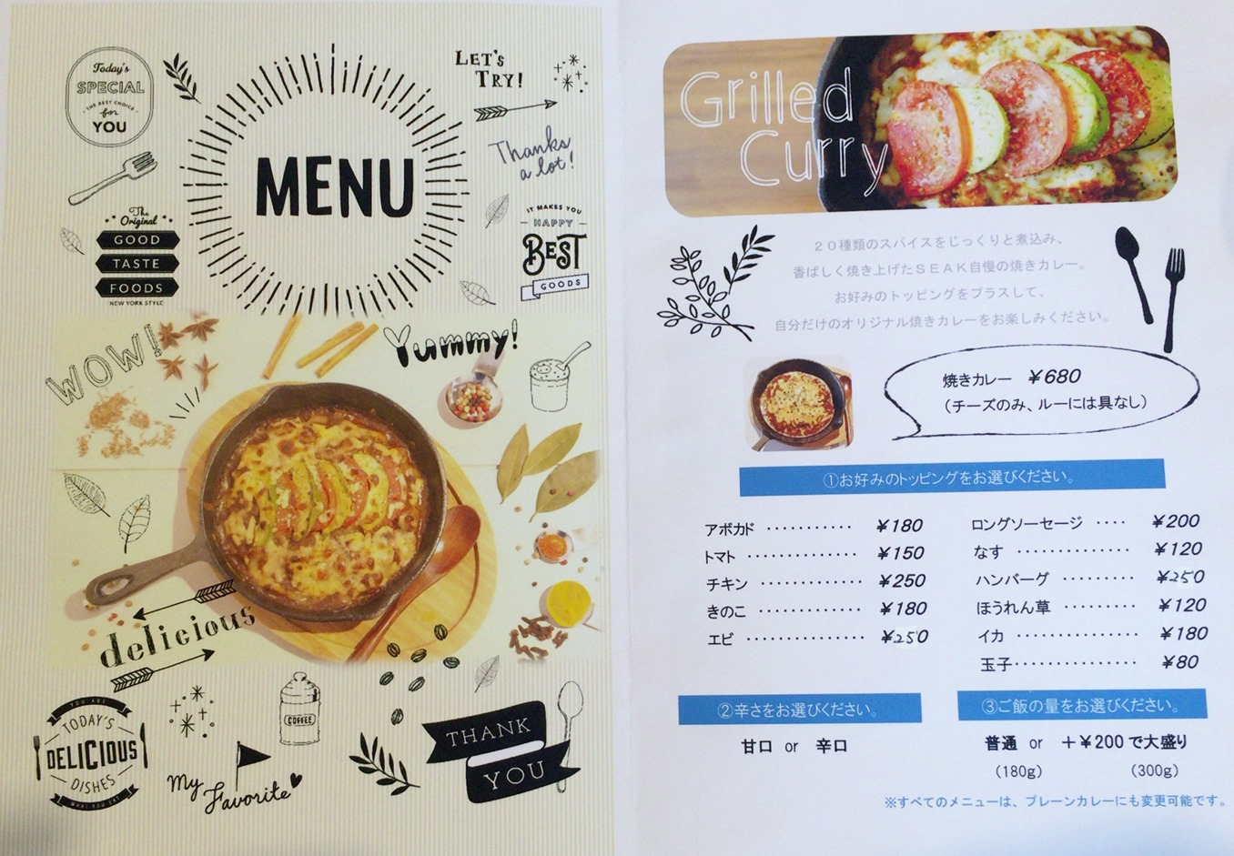 ここのメニューですが、基本は焼きカレーでトッピングを選ぶというシステムです。