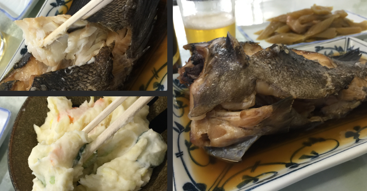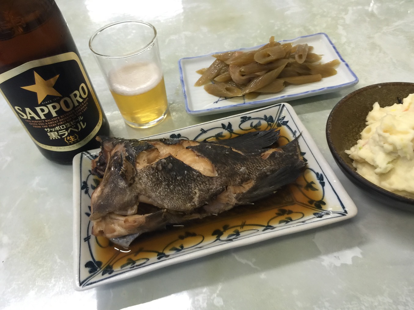 いいソイがあったので、ソイの煮つけ 400円とフキ 170円、そして定番のポテトサラダ 170円、ビンビール 500円です。