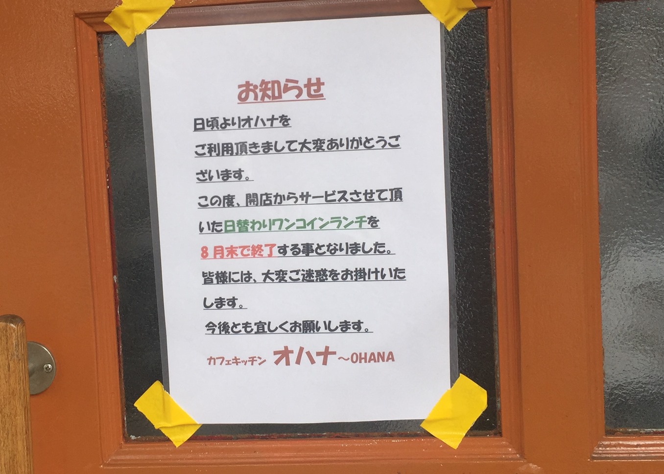 ワンコインランチを提供しているオハナさんでは、この張り紙です。