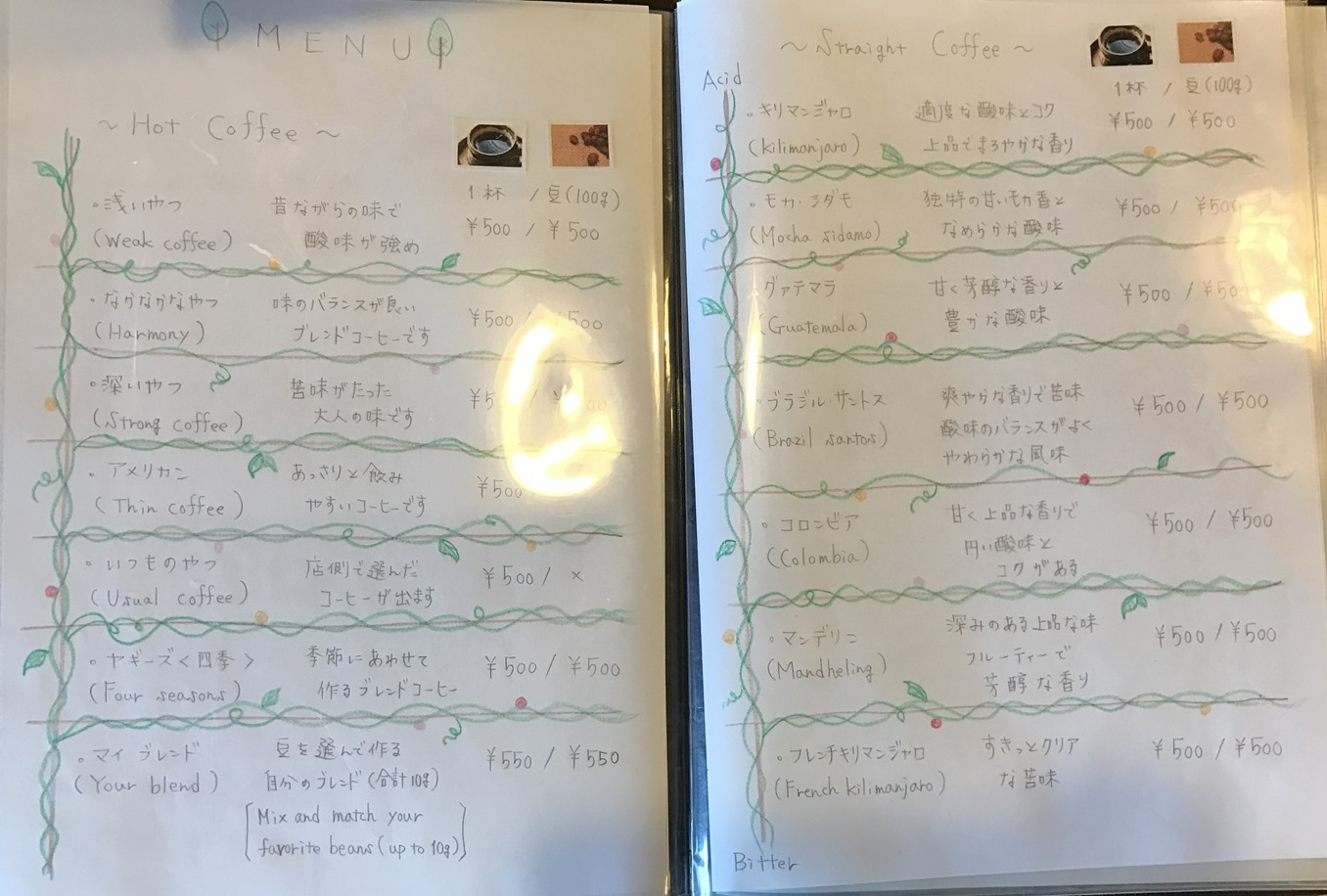 外の看板には、500円〜とありますので値段を聞いてみると、ここに書かれているのは、全部、500円ということでして、その中からストレートコーヒーのモカ・シダモにします。