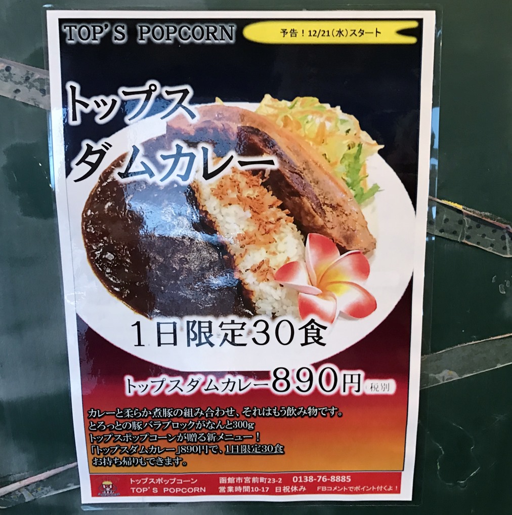 このポスターを見てみると、一日限定30食よいうことで、12月21日から提供しているという「トップス ダムカレー」なるものがあったので注文してみます。