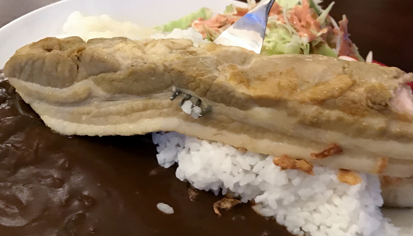 このカレー、なんといってもインパクトは、この豚バラ肉でして、なんと300gもあるんです。