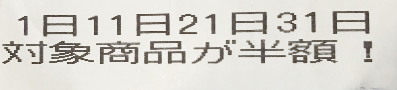 1日、11日、21日、31日 対象商品が半額!とありまして、お店のおねえさんに聞いてみると、それぞれのが決められていて半額になるそうです。