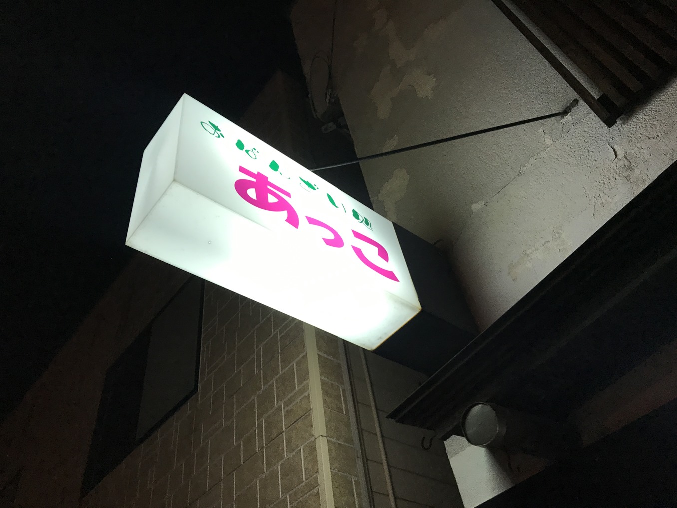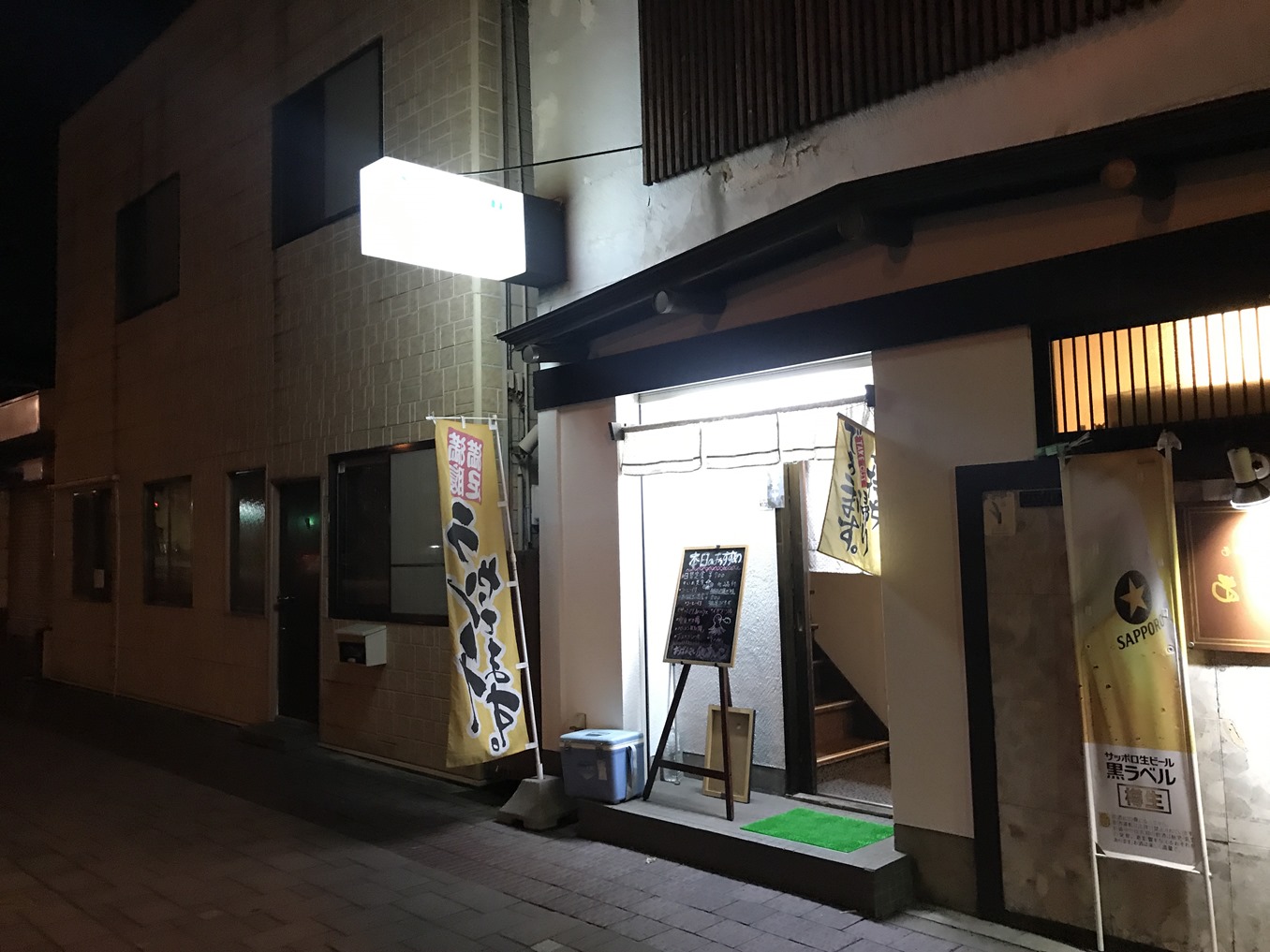 お店の前です。けっこうな暗さでも、今のスマホは、シャターなしで、このくらい写ります。
