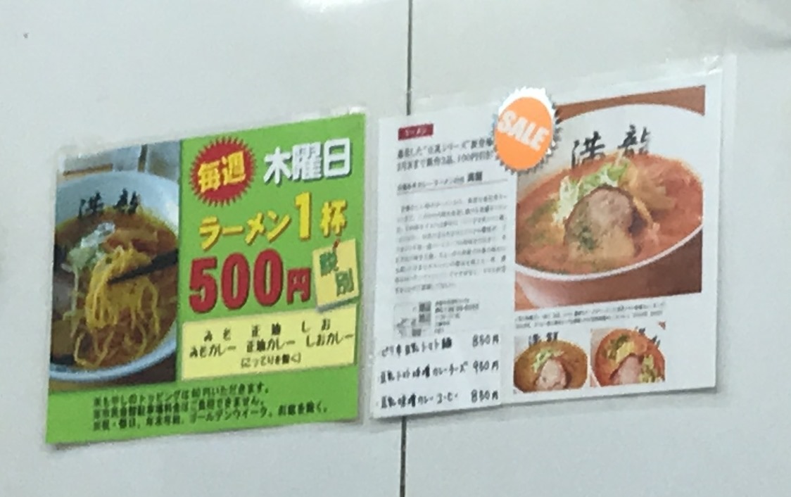 ワンコインラーメンの宣伝はお店の左手に黄色の張り紙がしっかりPRしています。