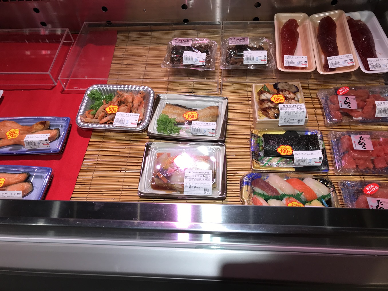 ほんとは、ここのまるかつ水産で刺身などの総菜を買って、越前屋さんで酒を買ってテーブル席で飲もうと思ってたんです。