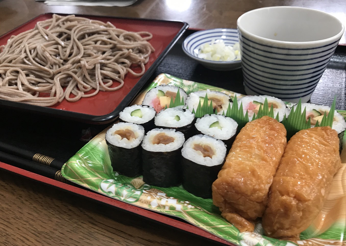 この日の飯は、スーパーのおいなりさんと巻きもんと干し蕎麦。