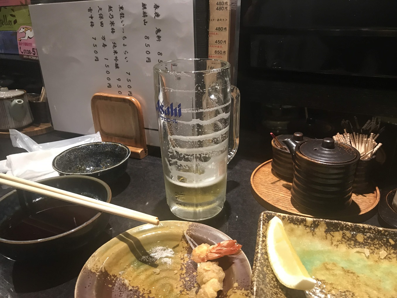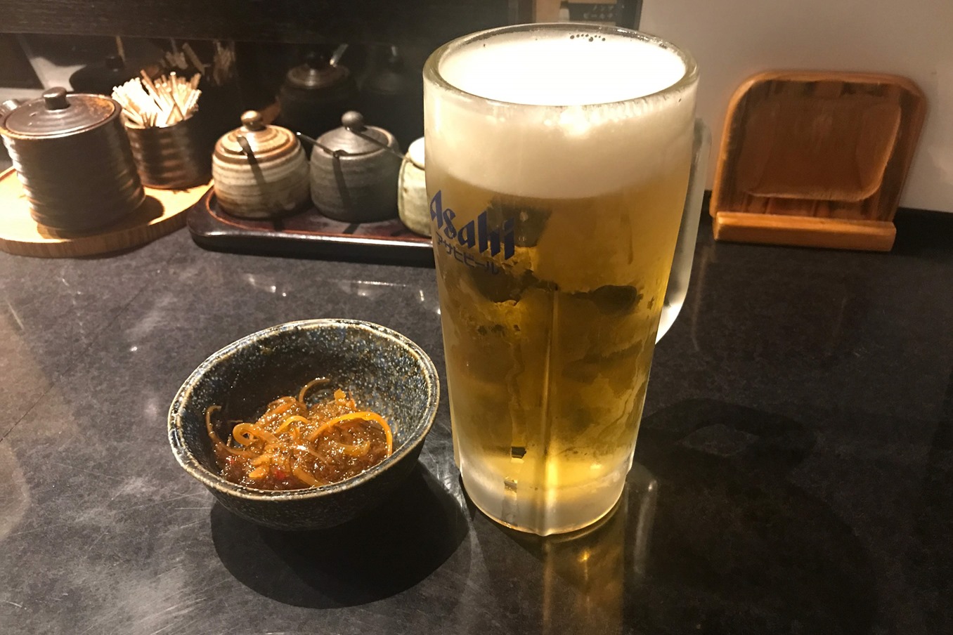 まずは生ビールです。650円(税込)と、いつもの横丁のお店よりいい値段です。 (^^)