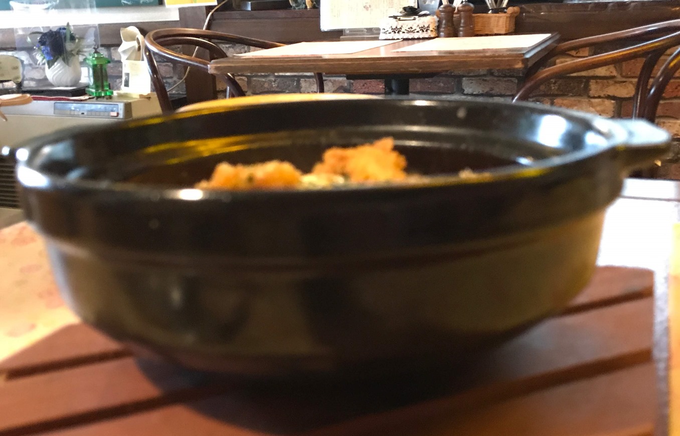 洋食なのに土鍋でして、そして横には箸ではなくスプーンとフォークです。