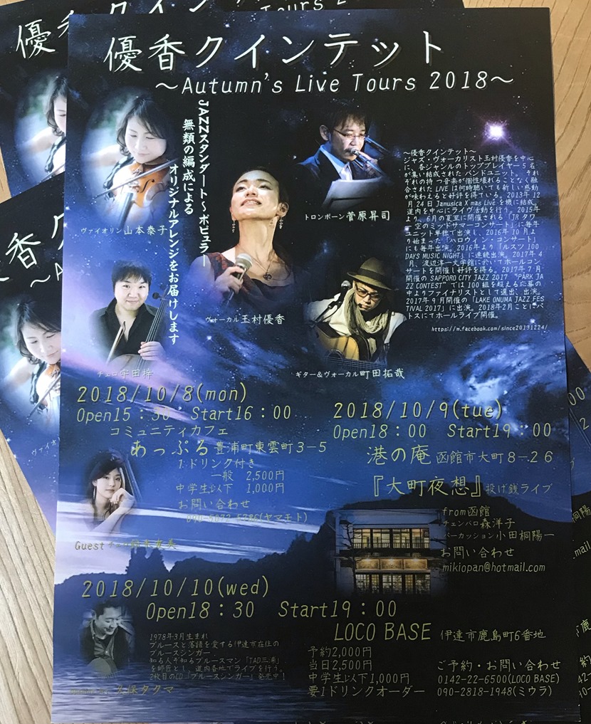明日の10月9日は、大町夜想は「優香クインテット」です。