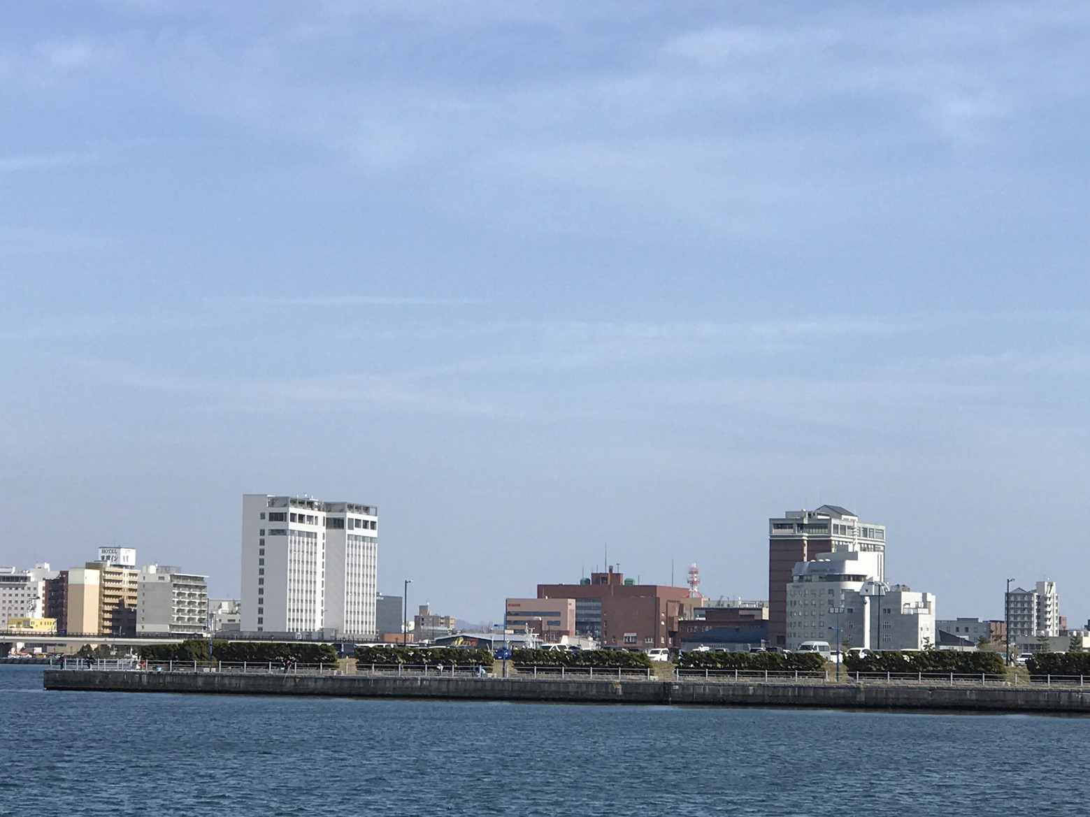 港から見える新しいホテル 「センチュリーマリーナ函館」(左白い高い建物)と函館国際ホテル。