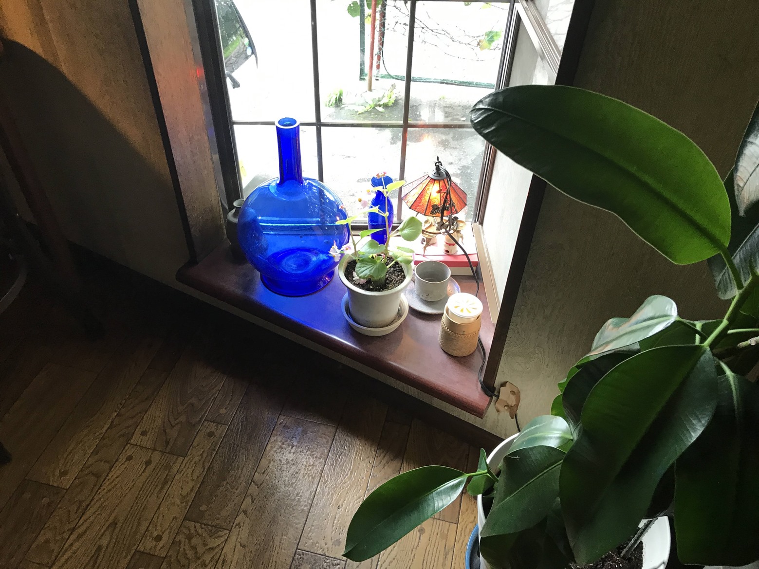 私の三点セットです。窓外の緑が鮮やか