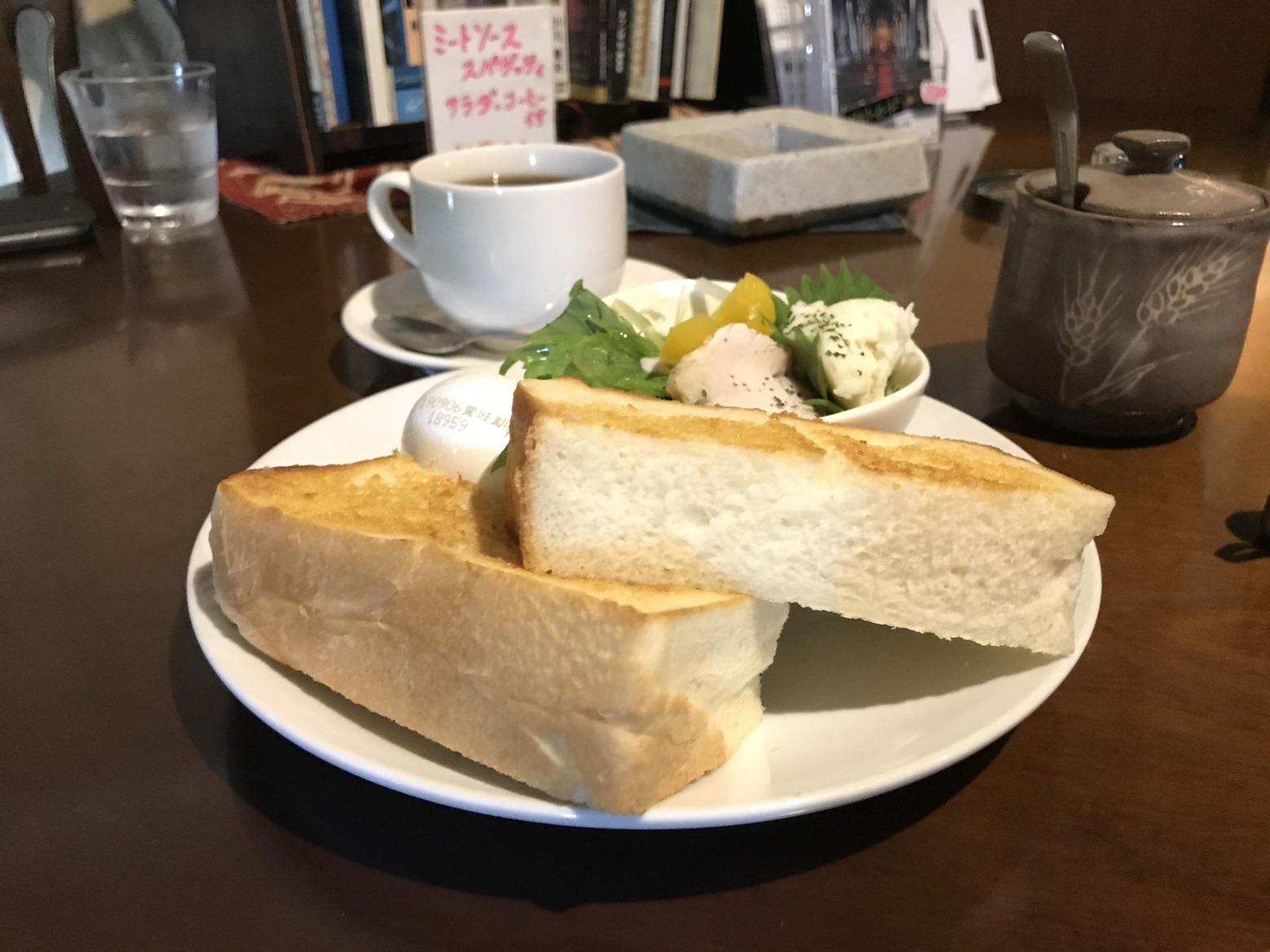 コーヒー、焼サンド、玉子、サラダという内容で、これはあがたい値段です。