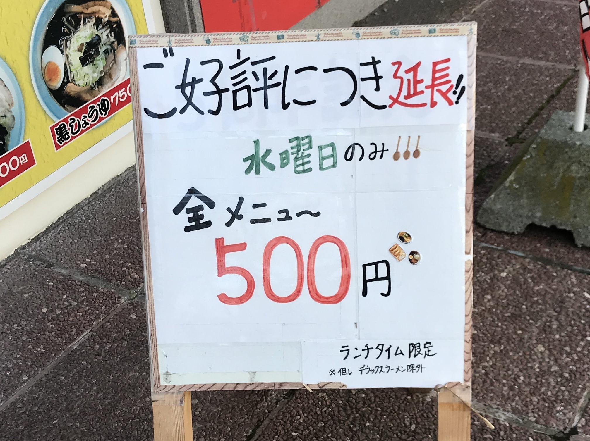 「ご好評につき延長!! 水曜日のみ全メニュー500円!」