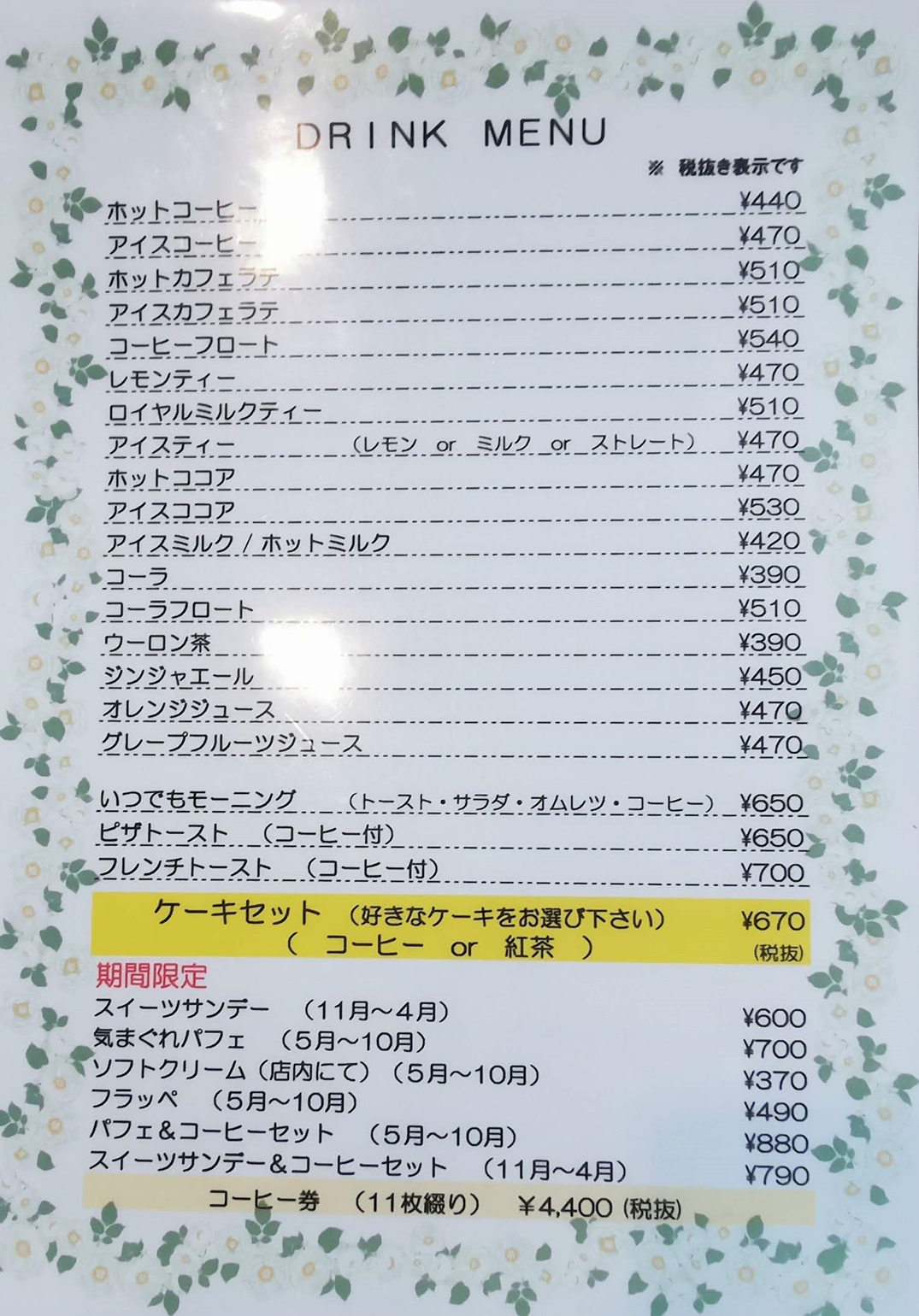 ドリンクメニューです。