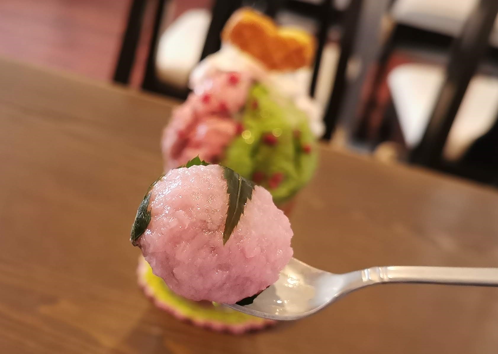 詳しくは、一番下には桃のソースと桜のソース、ラズベリー、その上には抹茶アイス、生クリームが入り、その上にはコーンフレーク、 桜のソースがかかり バニラソフトを入れて、ルビーチョコソフトと抹茶アイス、その上にラズベリーがちょちょと乗っかって、それに生クリームをのっけてワッフルと桜餅があり、さらにそこに桜のソースと桃ソースがかかっています。