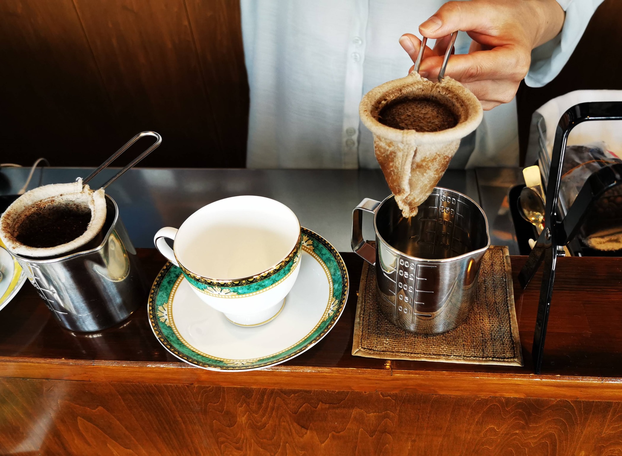 珈琲は、銅製の器を使い温度を調整していて、フイルターはネルドリップなんです。