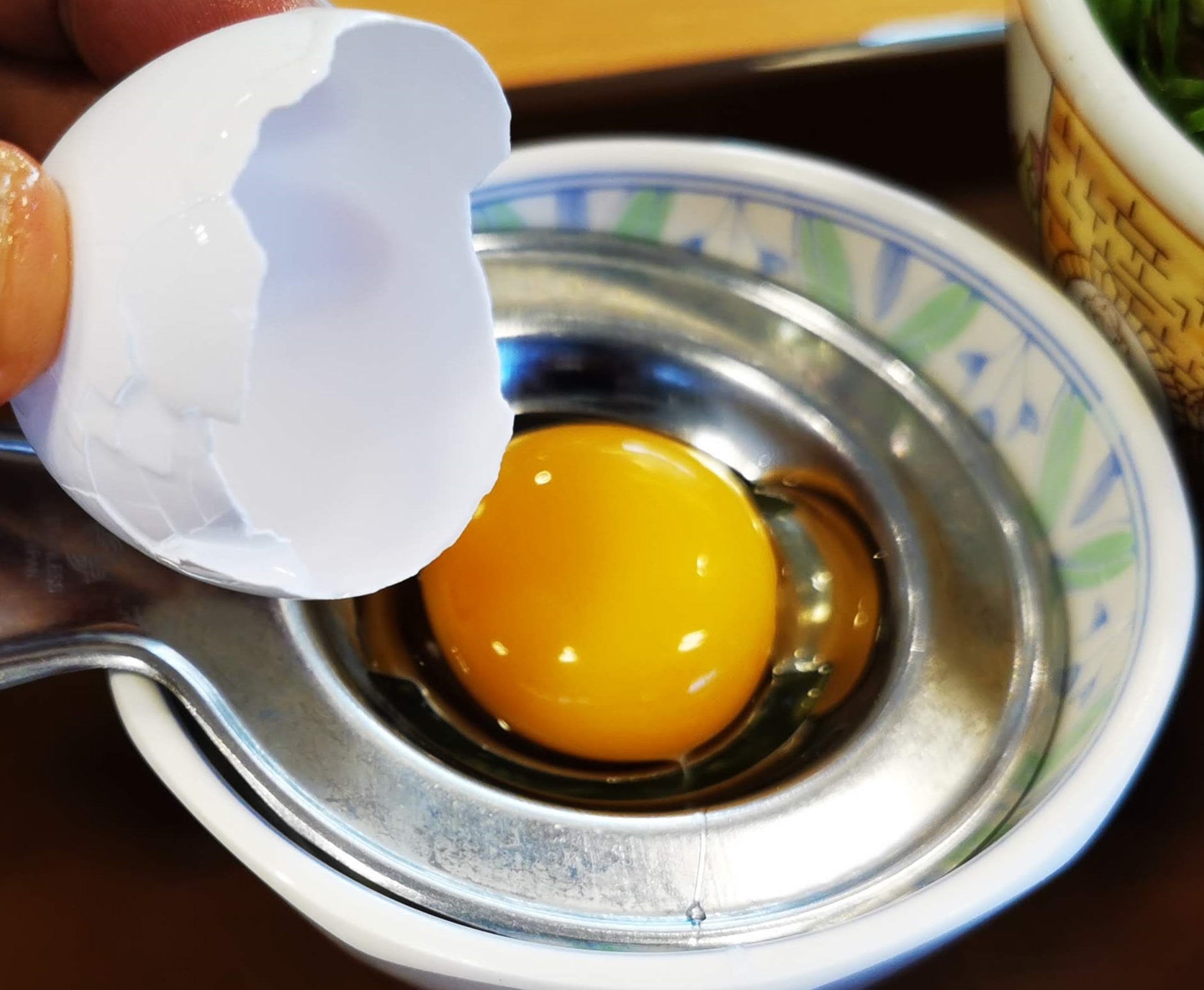 しっかり分離され、黄身を丼に入れるのですが、この容器は白身を落とすのに横にも隙間が空いていて、その隙間から角度を変えると黄身も横からスルリと抜けていくんです。
