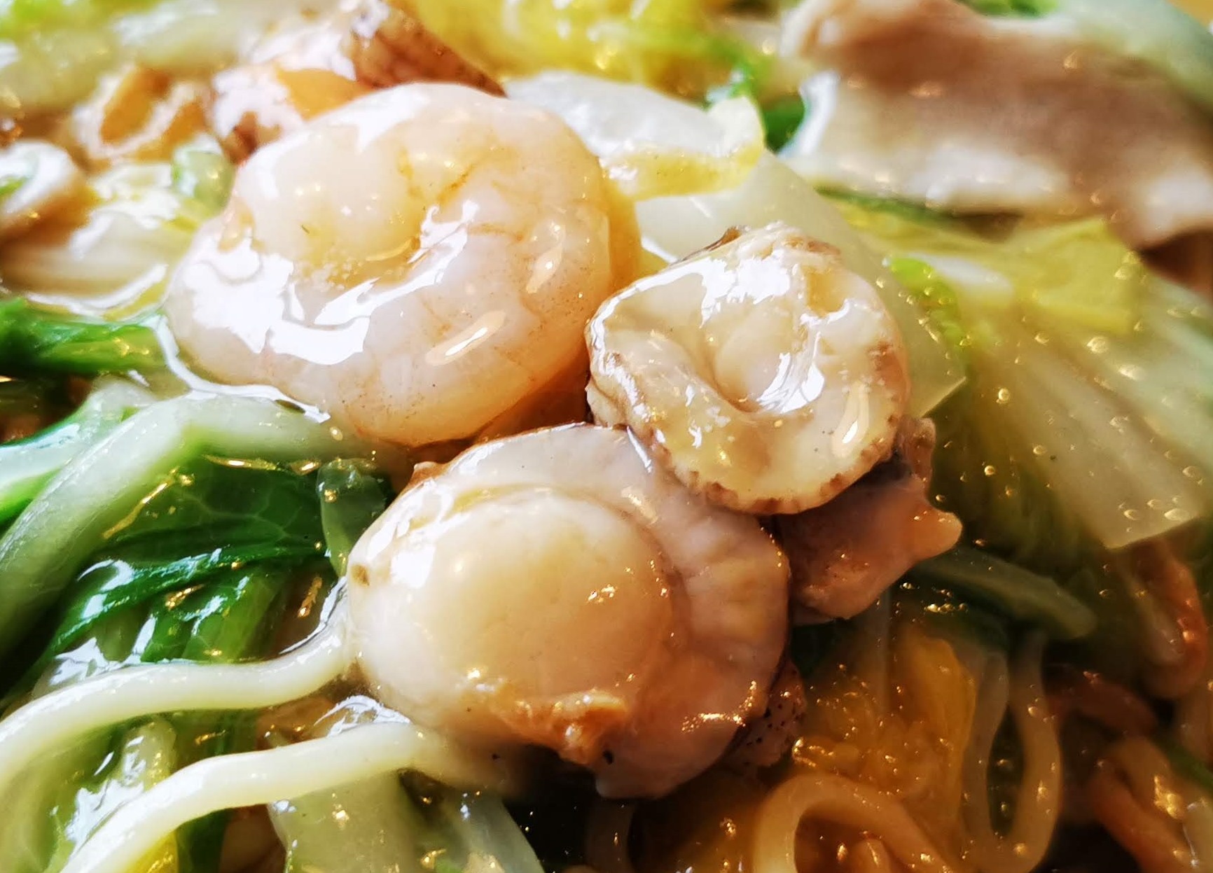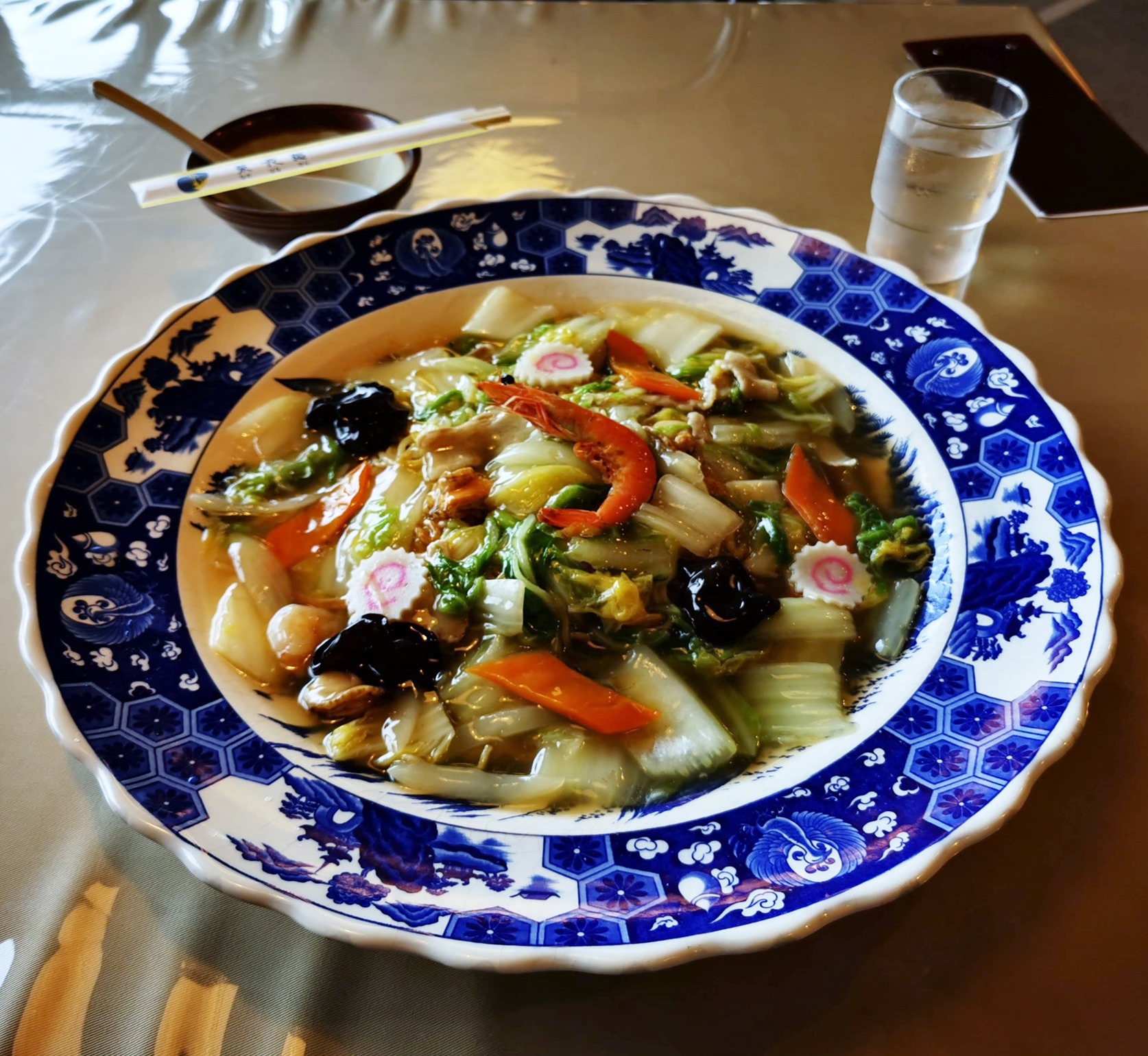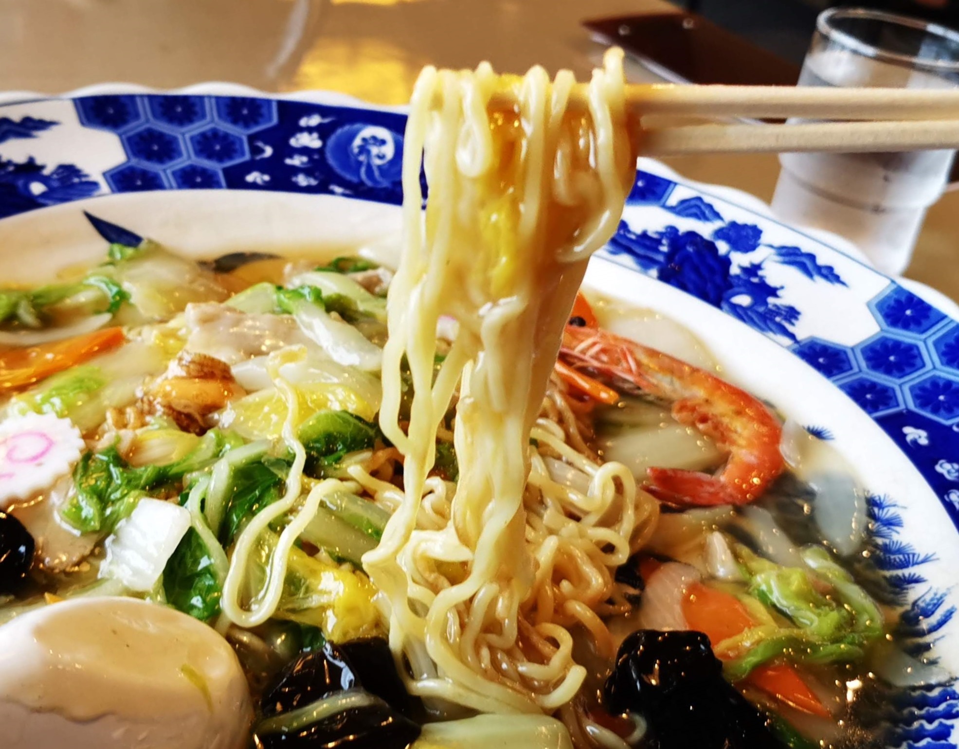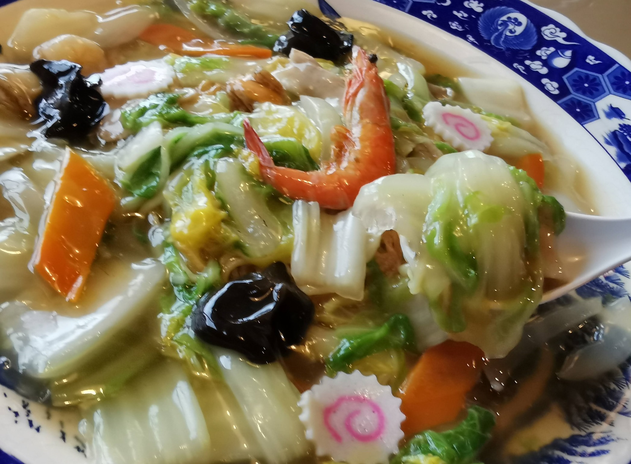 具は白菜が多く、きくらげ、ニンジン、ナルト、海老、ベビーホタテ、肉などが入っています。
