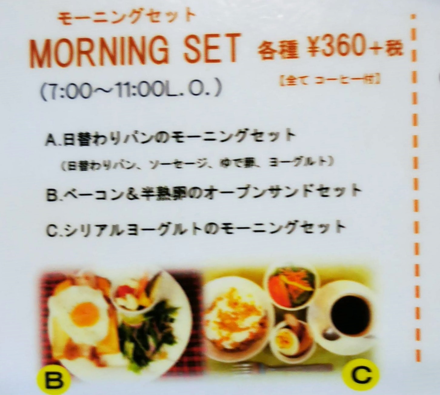 モーニングセットには、ABCのメニューがあります。