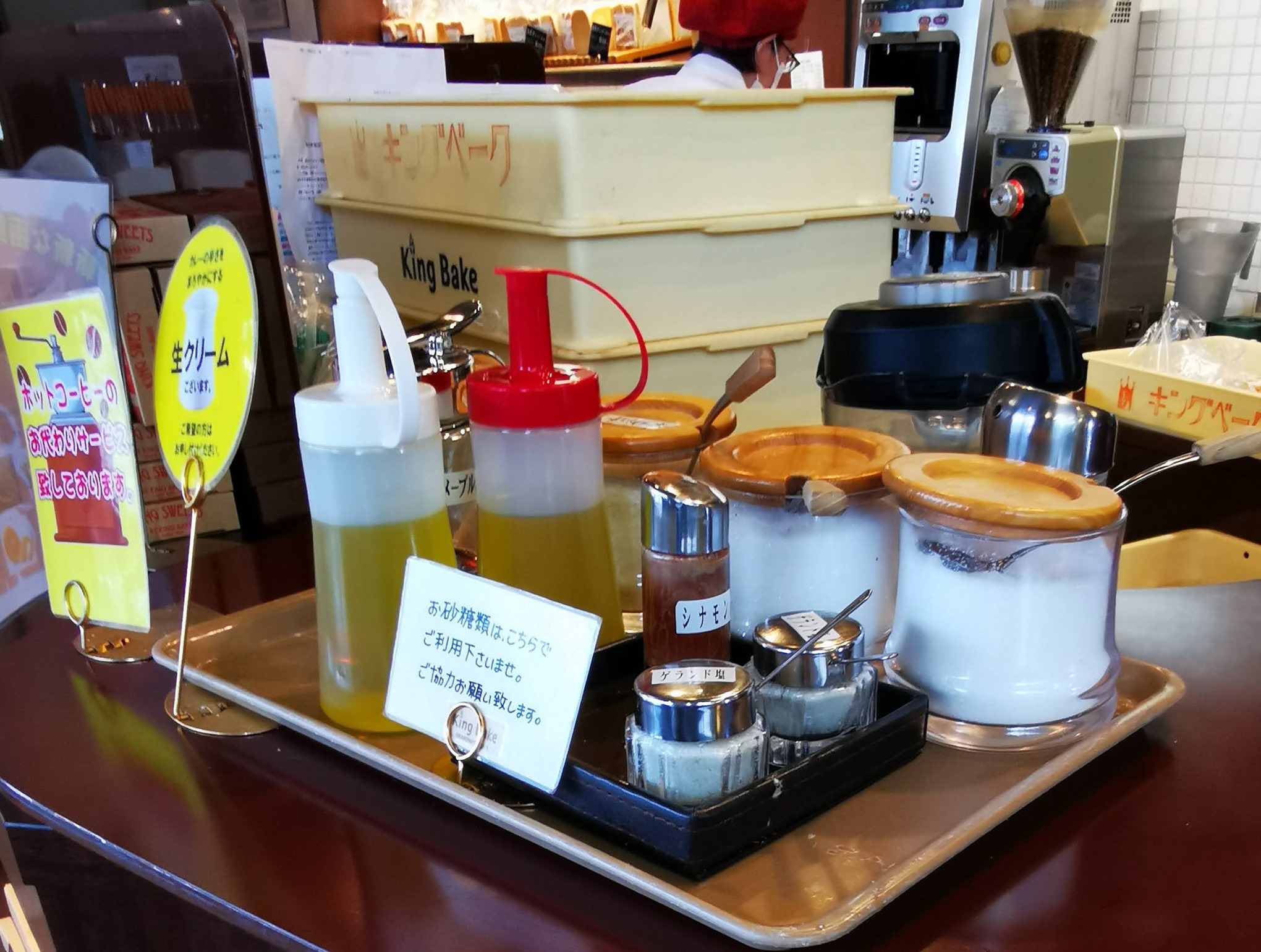 こちらのカウンターには砂糖、シナモン、はちみつなどがあります。生クリームは申し出るそうです。