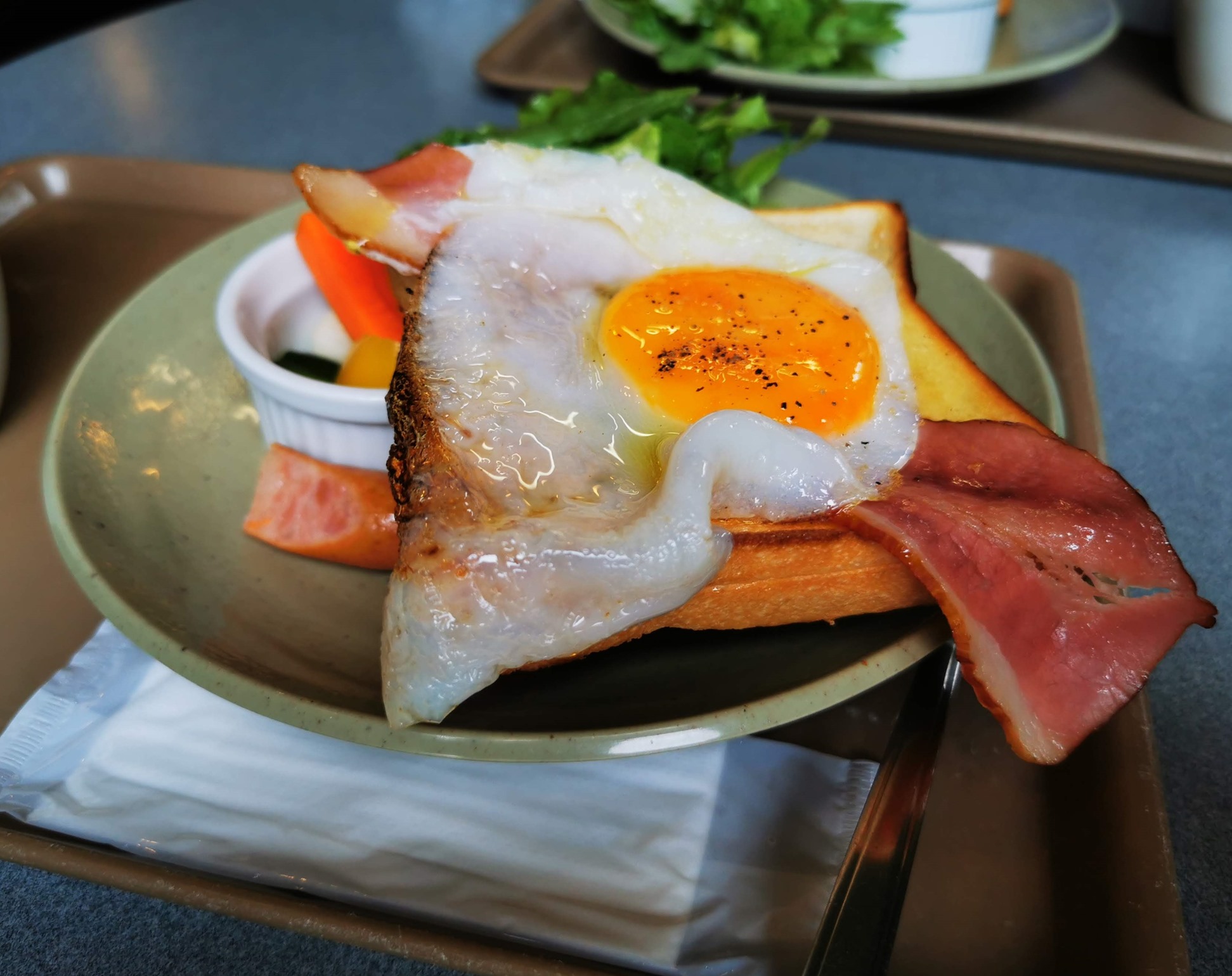 モーニングセットBの「ベーコン&半熟玉子のオープンサンドセット」です。396円(税込)