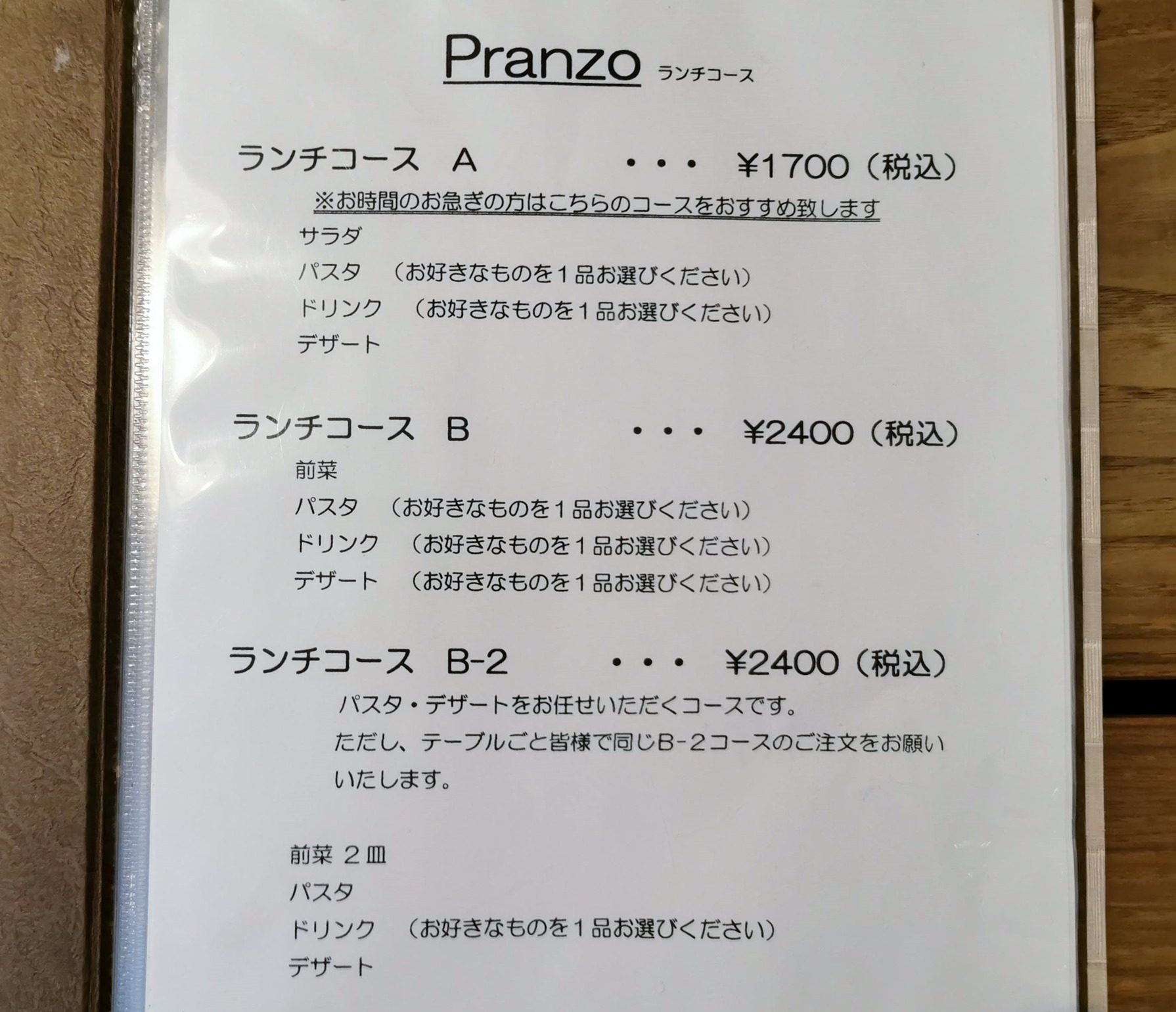 ランチコース B- 2は前菜が2皿と多いんですがパスタが一種類なので、今回も別々なパスタが選べるランチコースBにしてみます。2400円(税込)