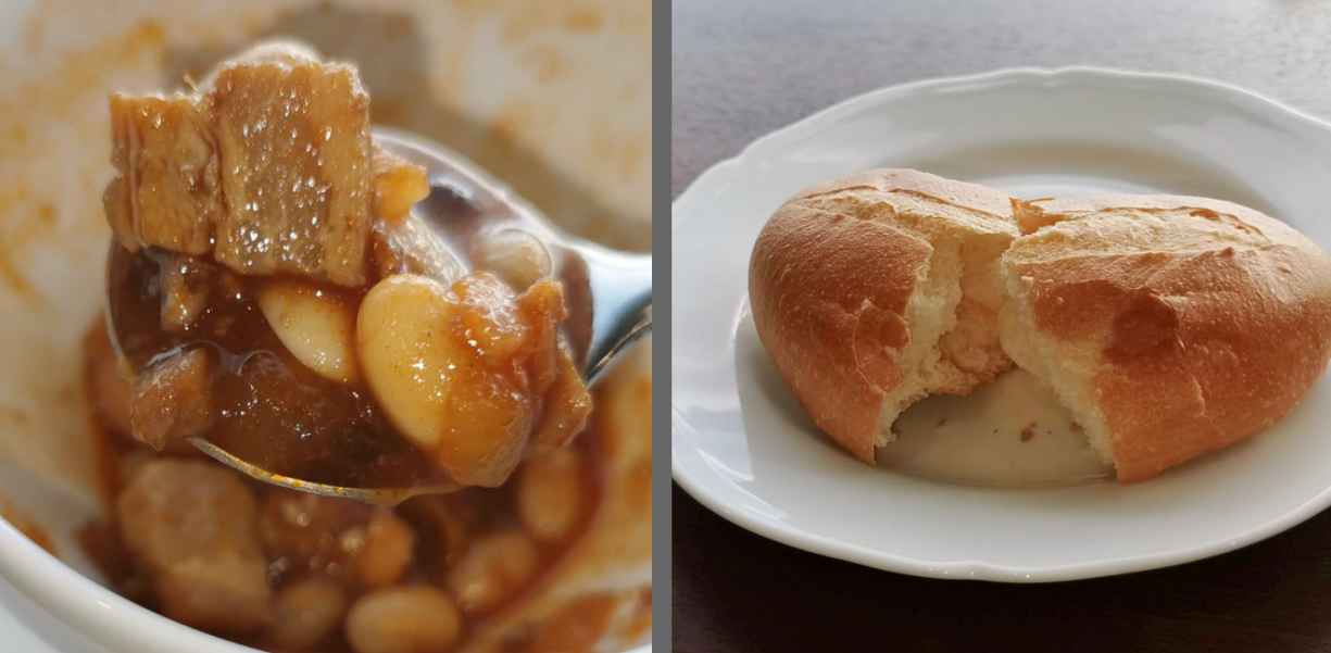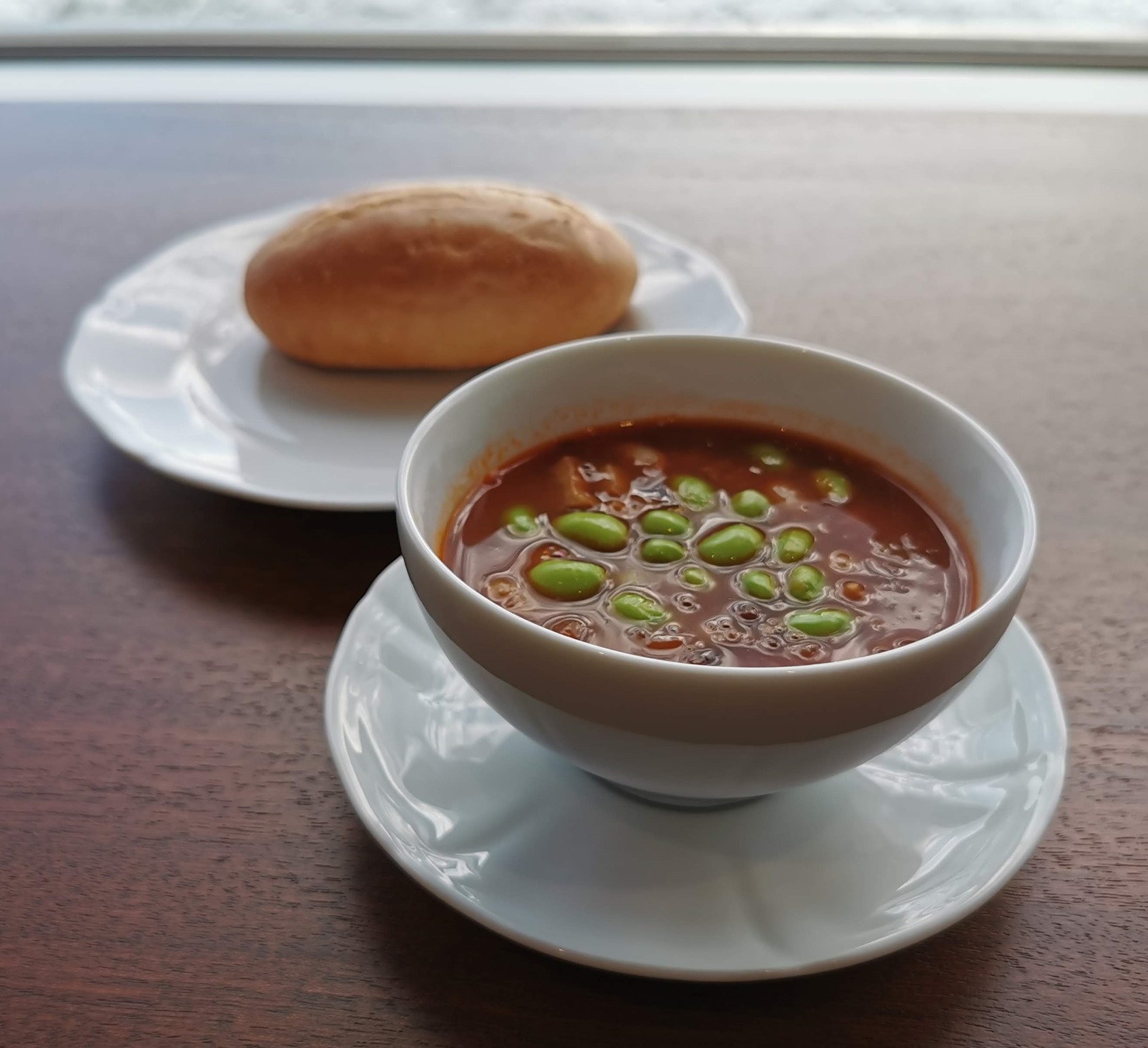 ちょっとパンケーキだけでは足りないので「豆のスープ パンつき」です。550円