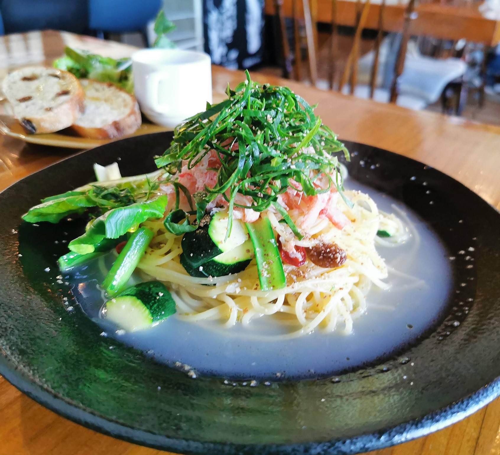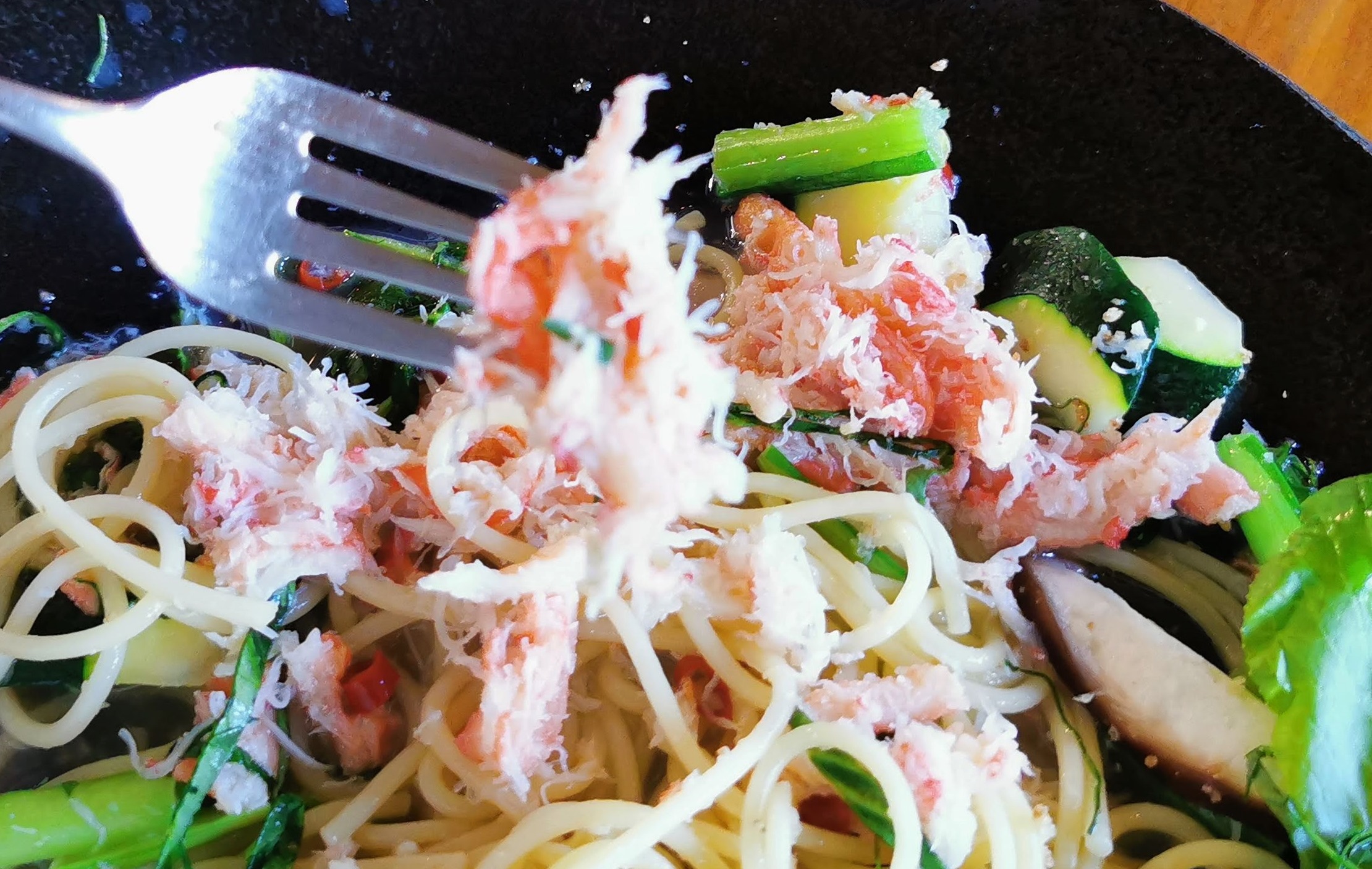 ズワイガニとズッキーニと小松菜のオイルパスタなんてお目にかかったことないメニューです😳