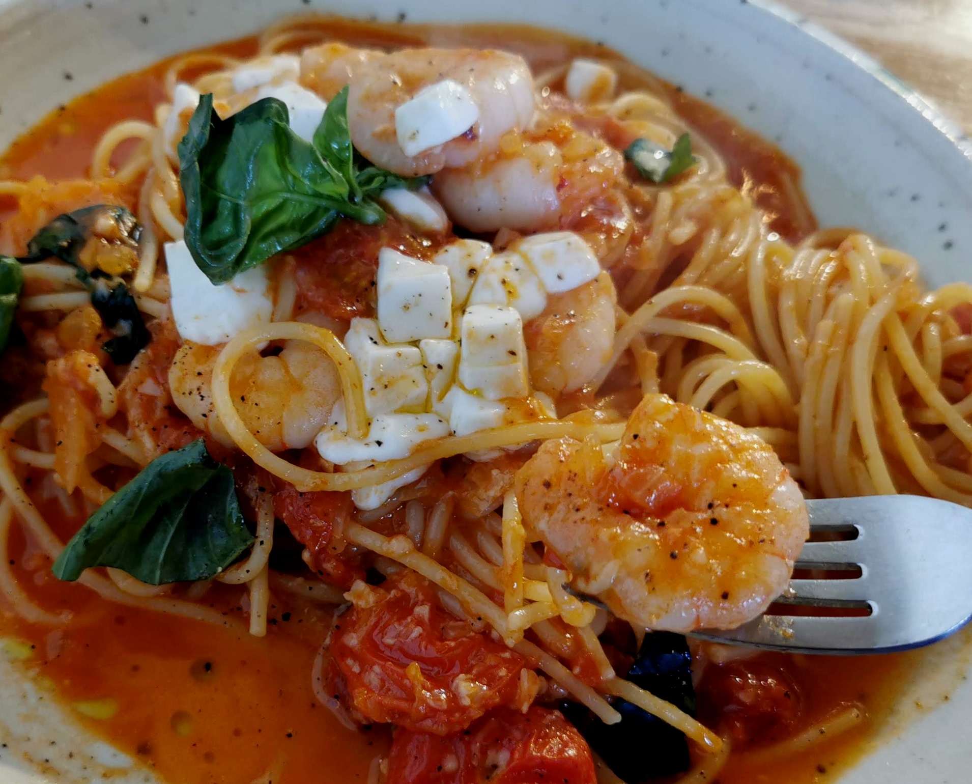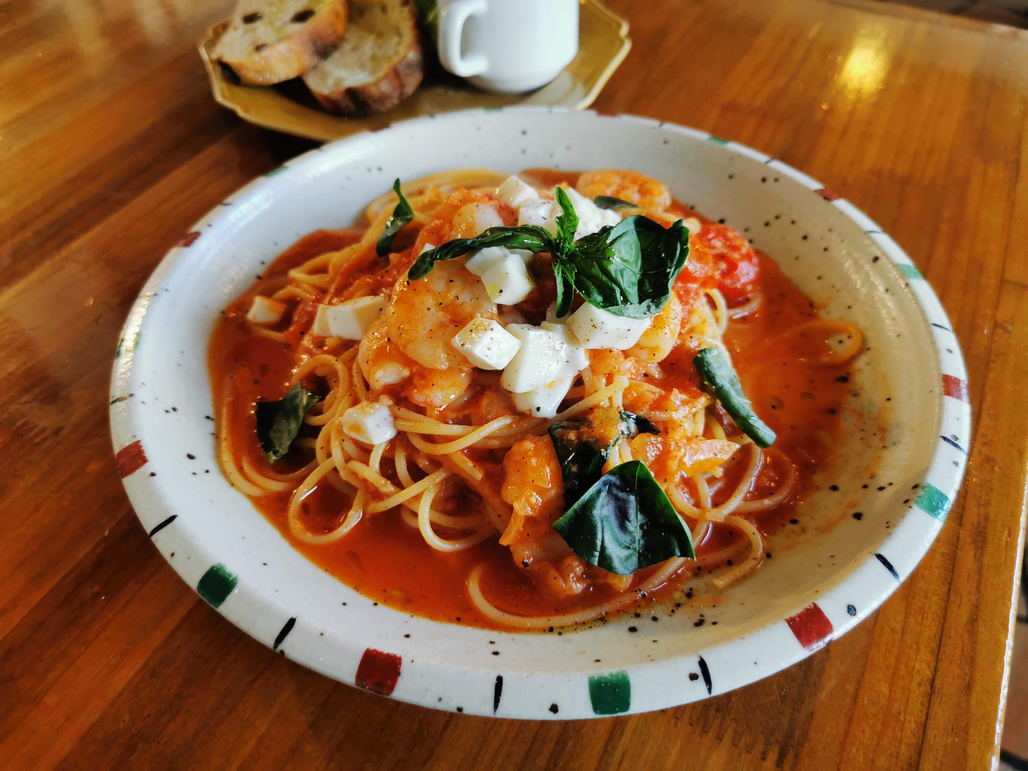 こちらは「エビとモッツァレラチーズトマトソースのパスタ」です。