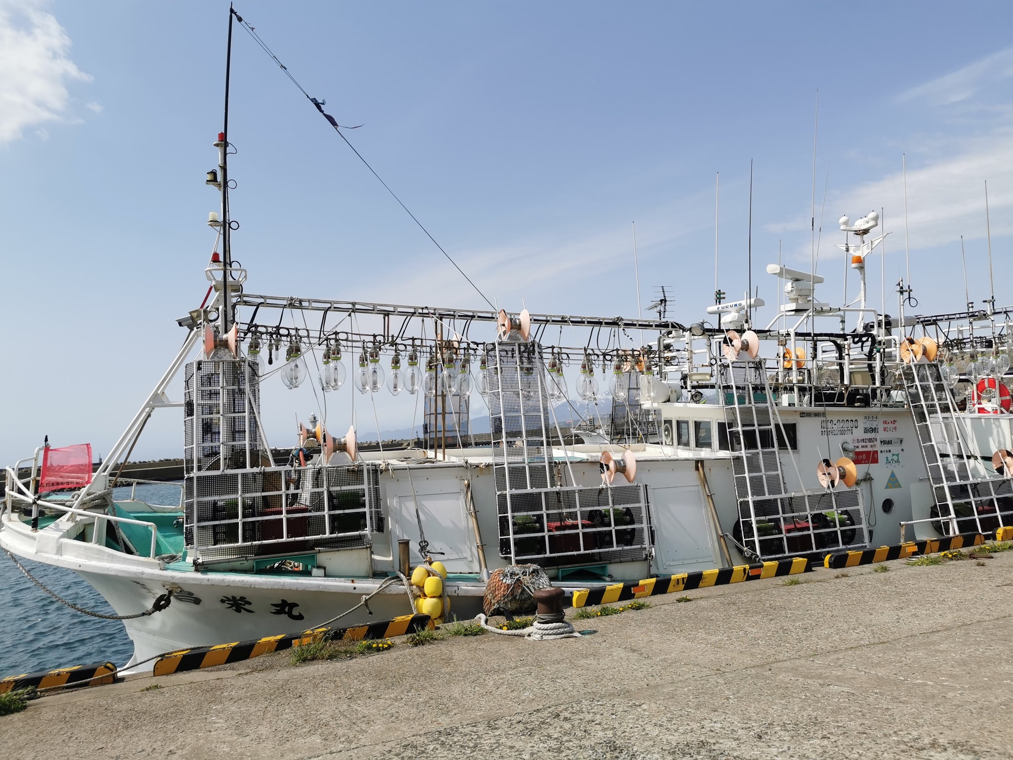 海産物販売所の前の船。集魚灯が芽だちますま。
