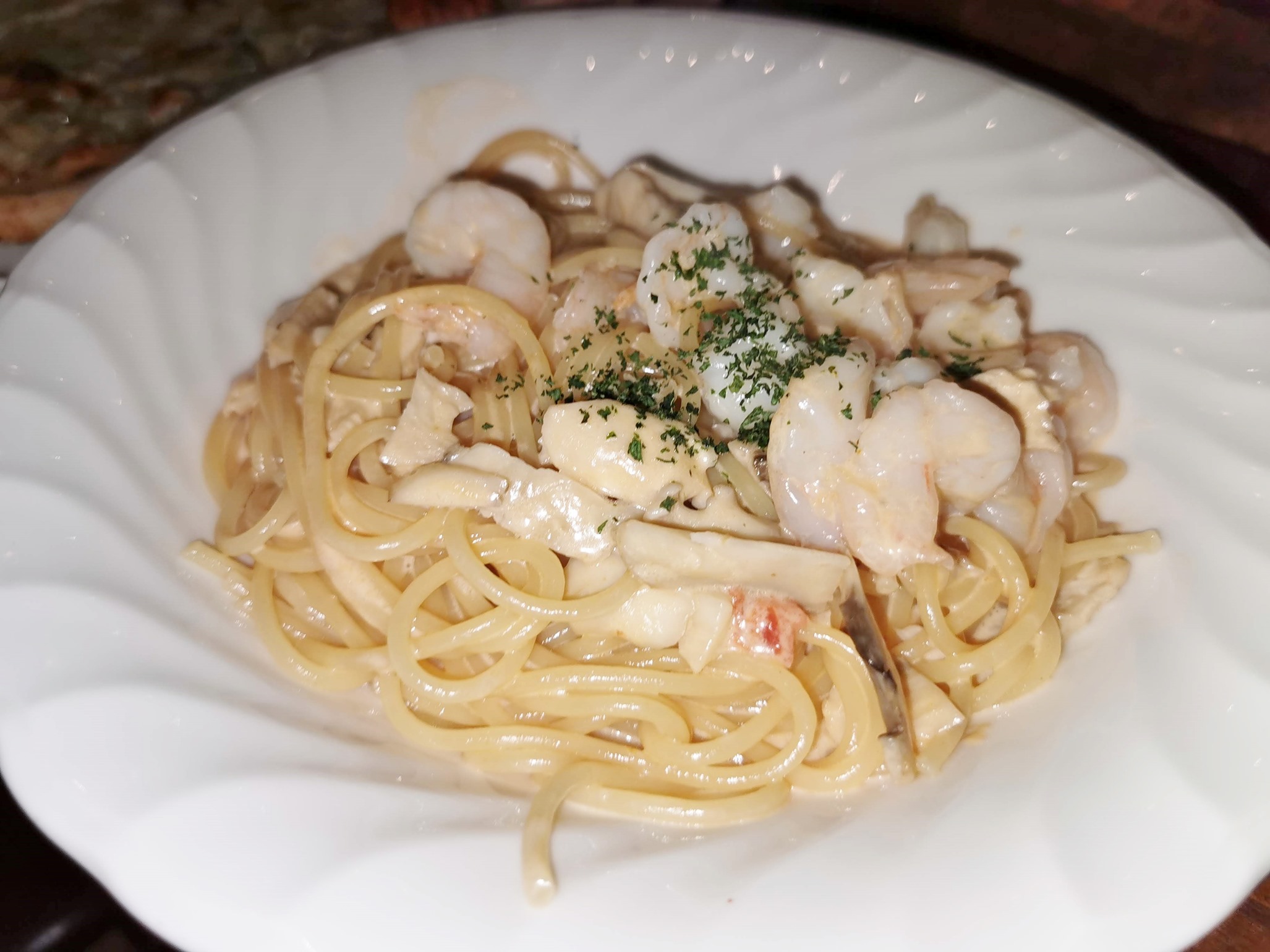パスタは2種類があり、「まいたけと海老のクリームパスタ」にしました。1090円