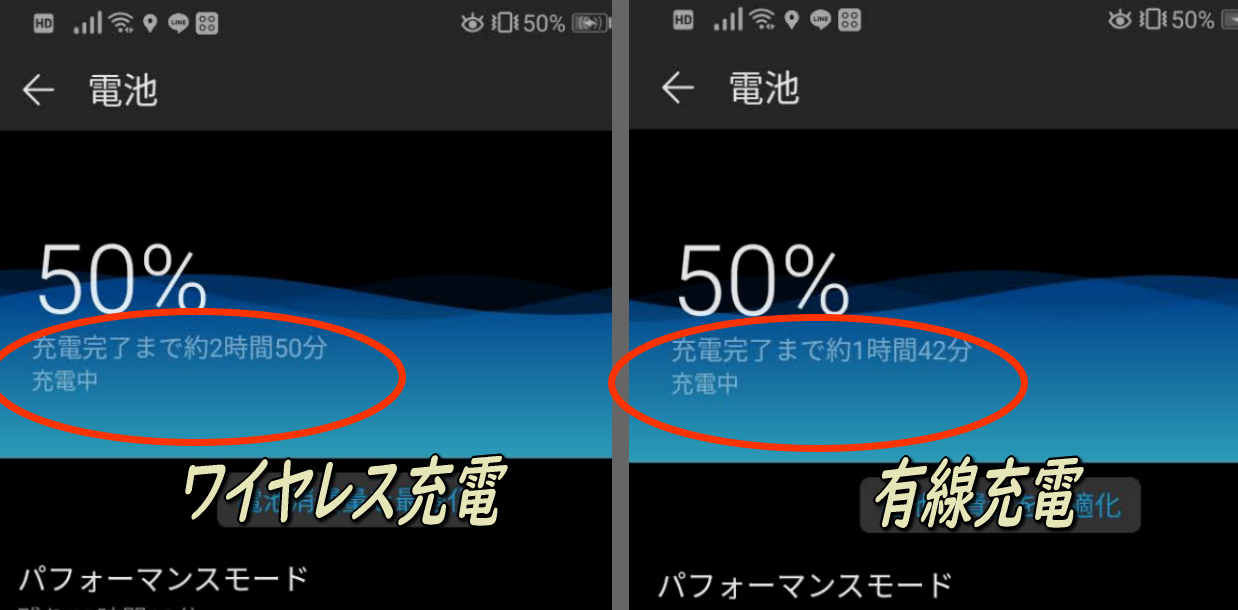 このスマホの電池容量は4100mAhですので、残り半分はワイヤレスでは2時間50分で、有線では1時間42分で満充電となります。