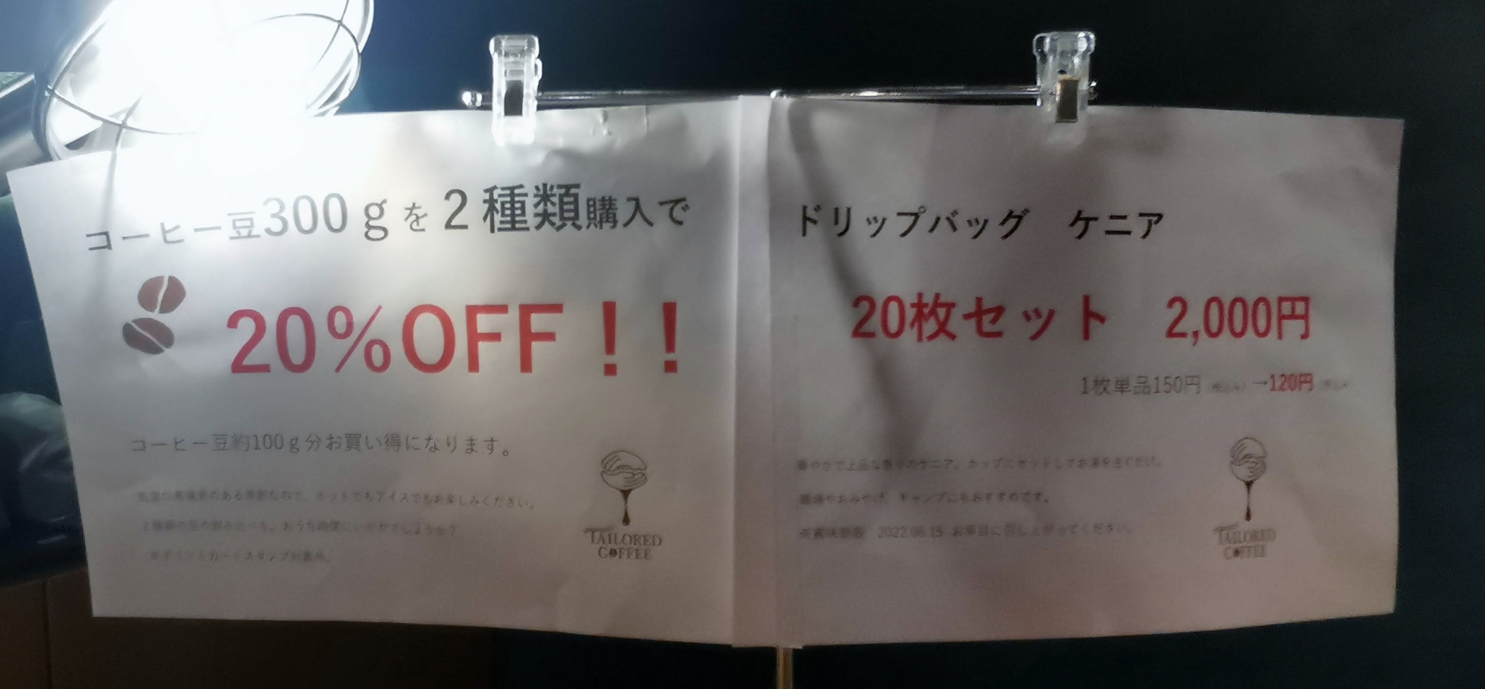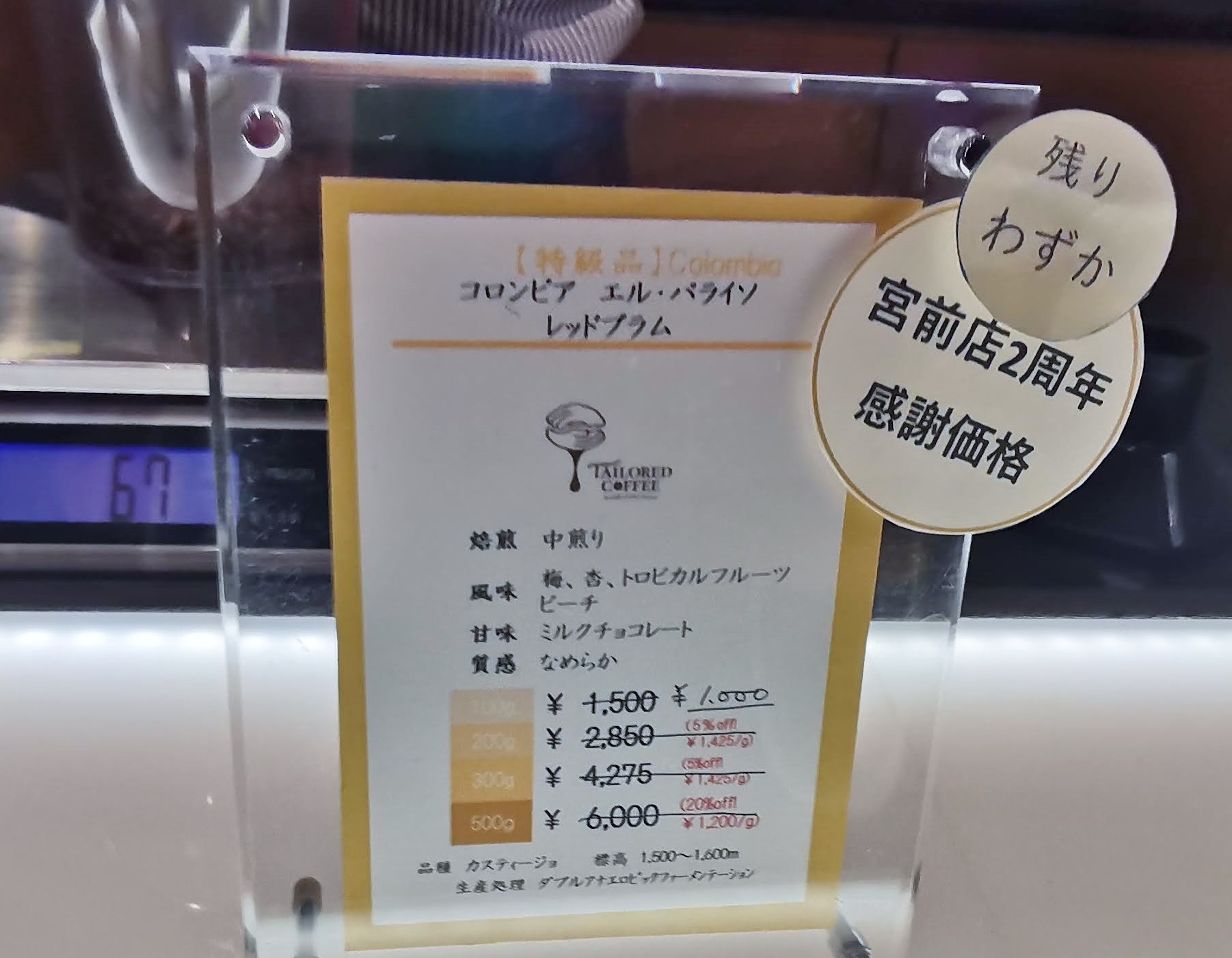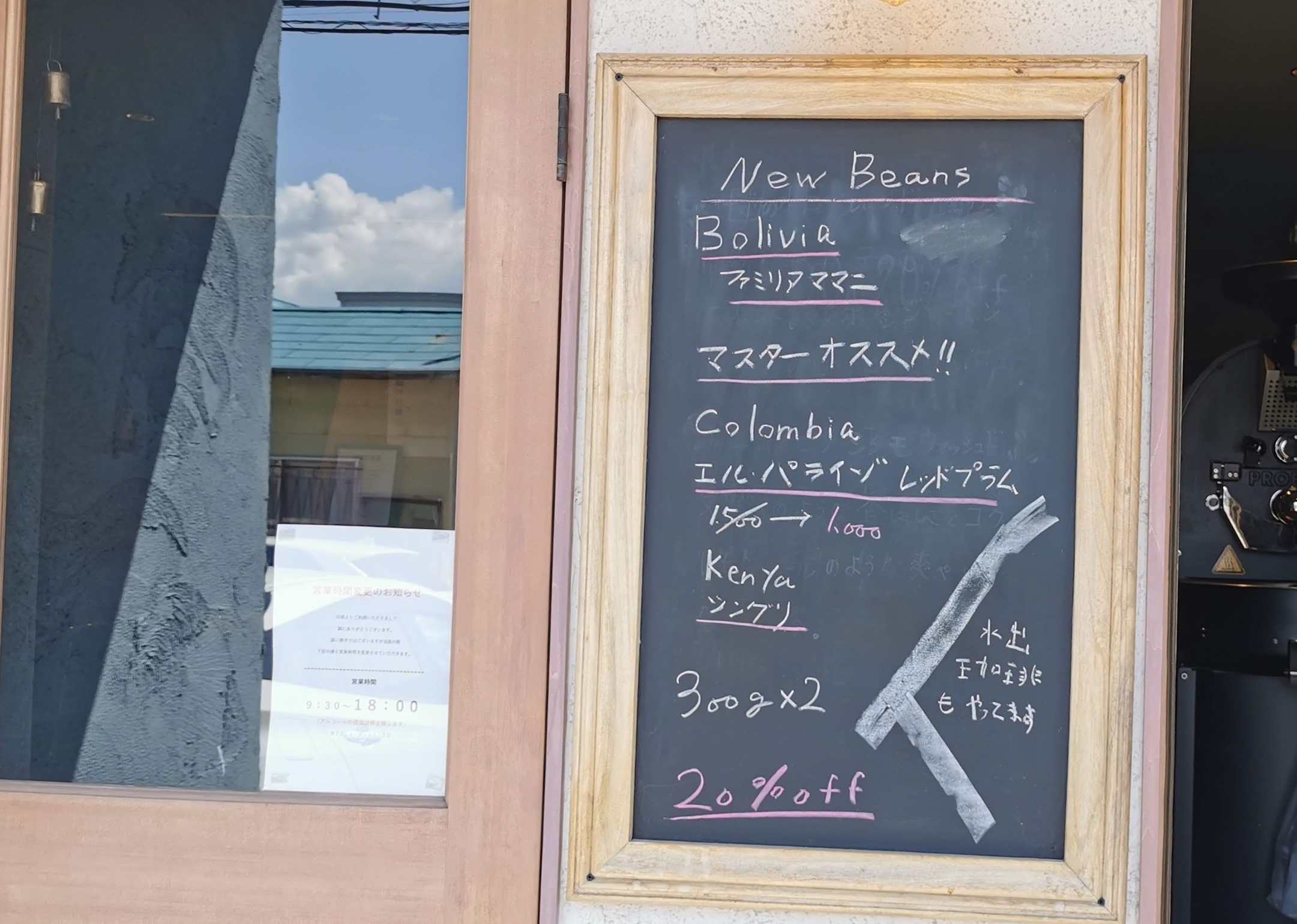お店のこのボードには、2周年感謝価格のコーヒー豆が販売されていました。