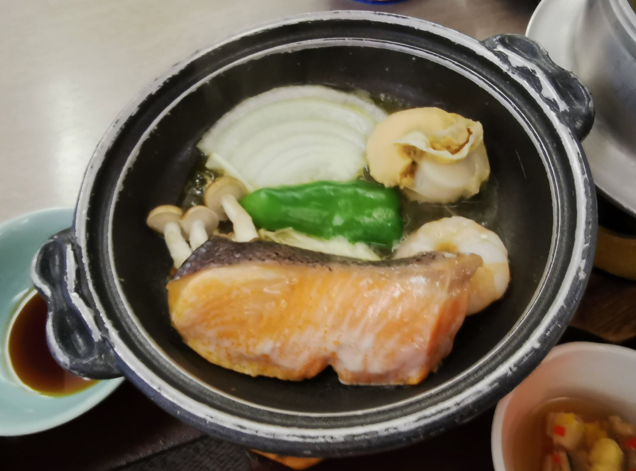 鮭、海老、ホタテ、しめじ、タマネギなどでした。