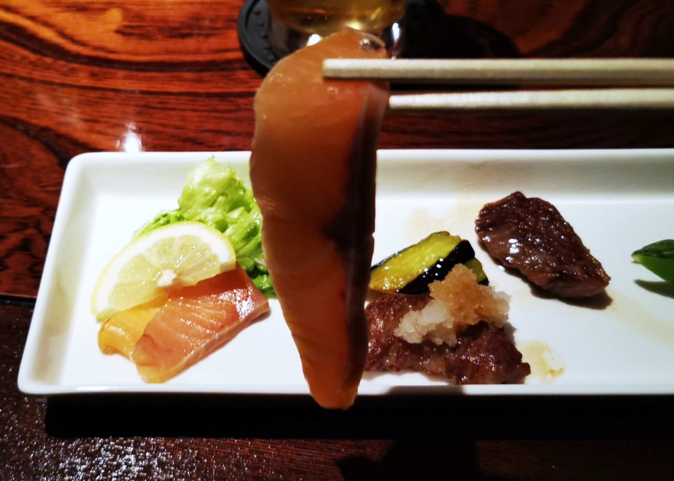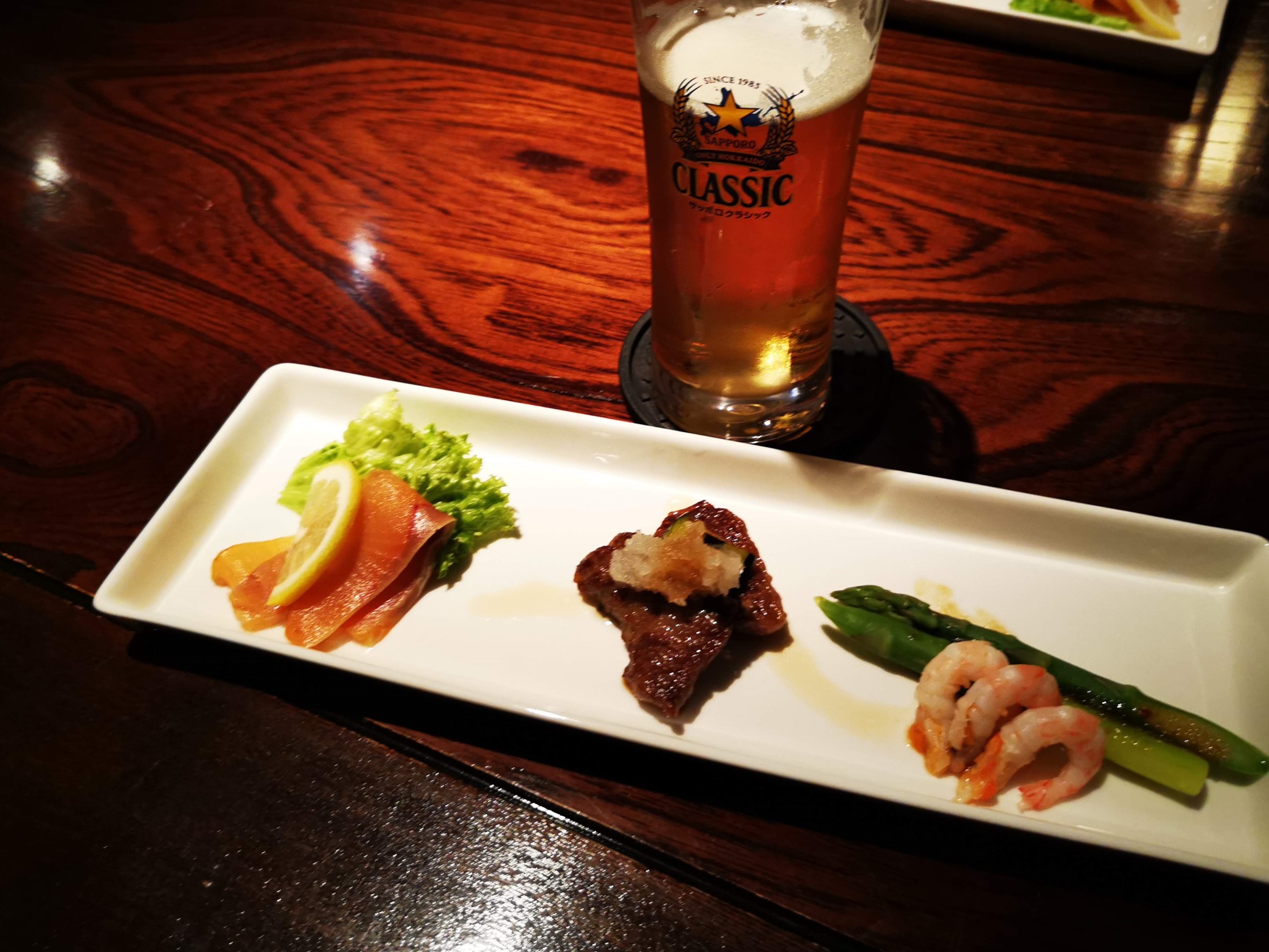 前菜は、自家製サーモンとビーフのハラミ、海老とアスパラのサラダです。